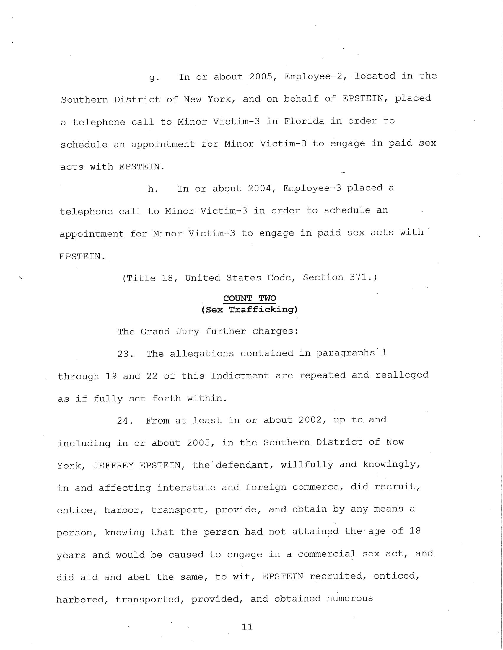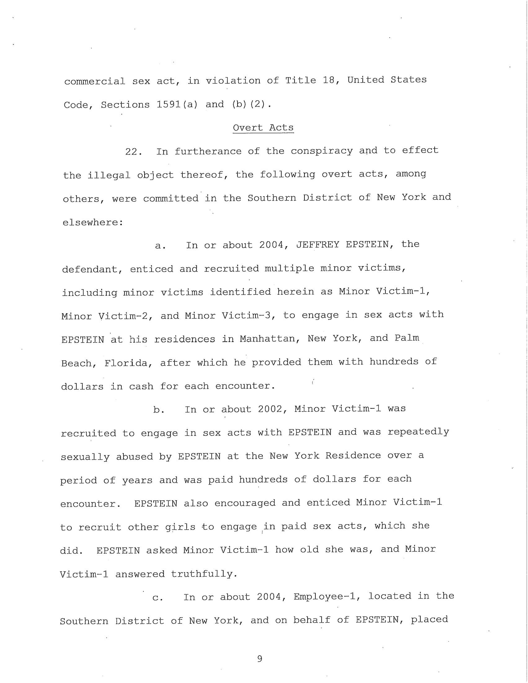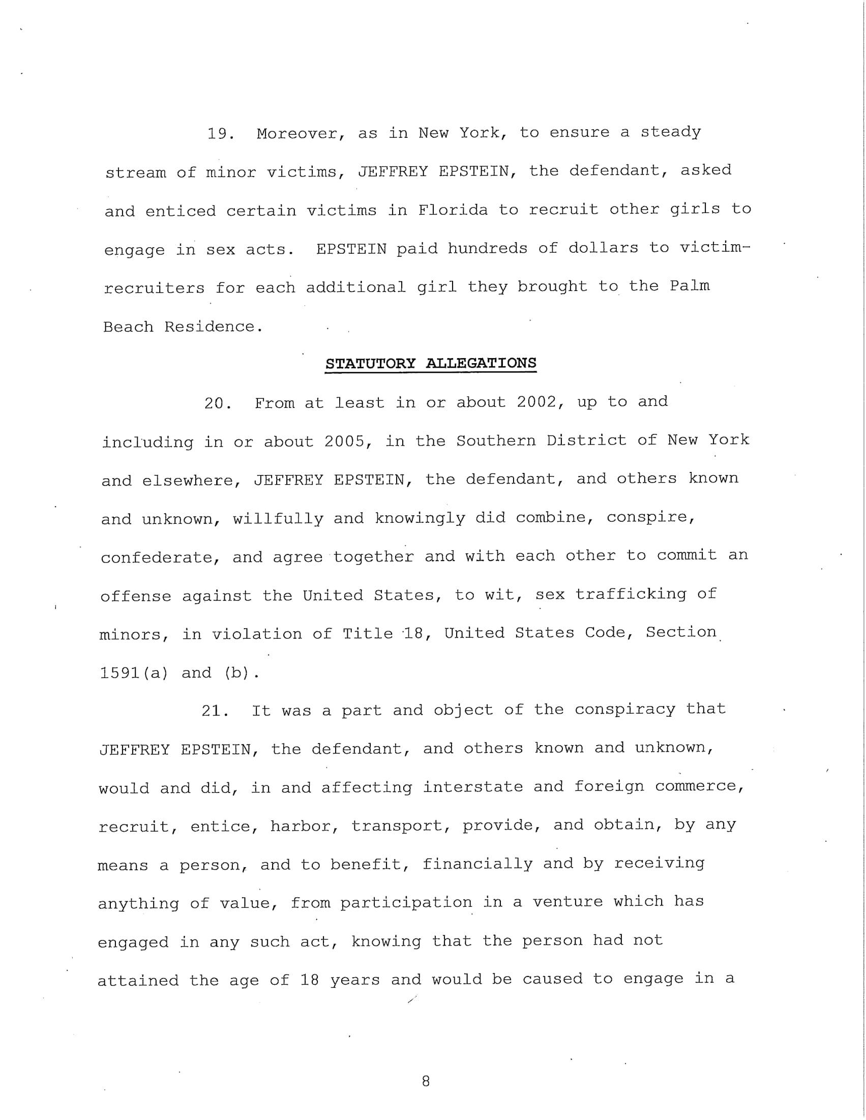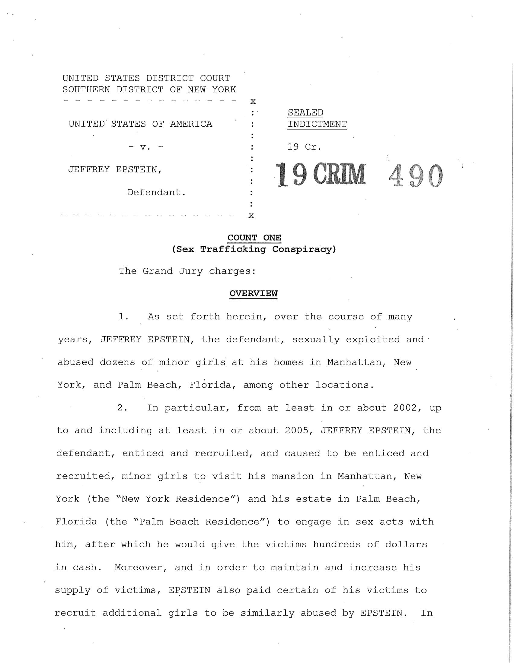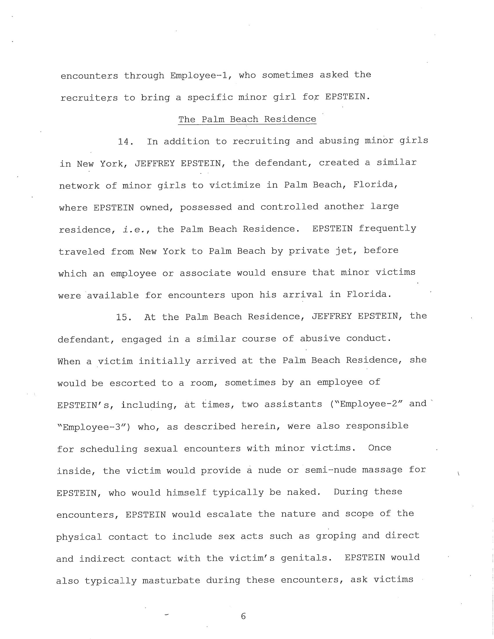 The federal indictment filed in June by the Department of Justice cited multiple cases of sexual abuse by Epstein, “In or about 2002, Minor Victim-1 was recruited to engage in sex acts with EPSTEIN and was repeatedly sexually abused by EPSTEIN at the New York Residence over a period of years and was paid hundreds of dollars for each encounter. EPSTEIN also encouraged and enticed Minor Victim-1 to recruit other girls to engage in paid sex acts, which she did. EPSTEIN asked Minor Victim-1 how old she was, and Minor Victim-1 answered truthfully.”