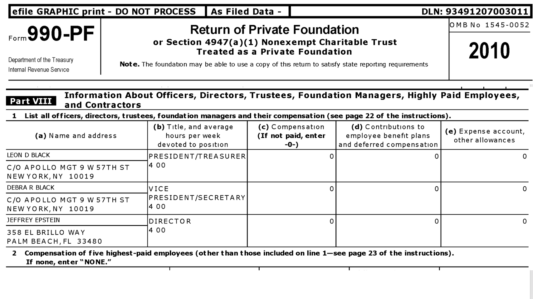 Epstein along with Black and Black’s wife served as the directors of the Leon Black Family Foundation in the years leading up to Epstein’s first plea deal that made him a registered sex offender and for four years after Epstein’s conviction.