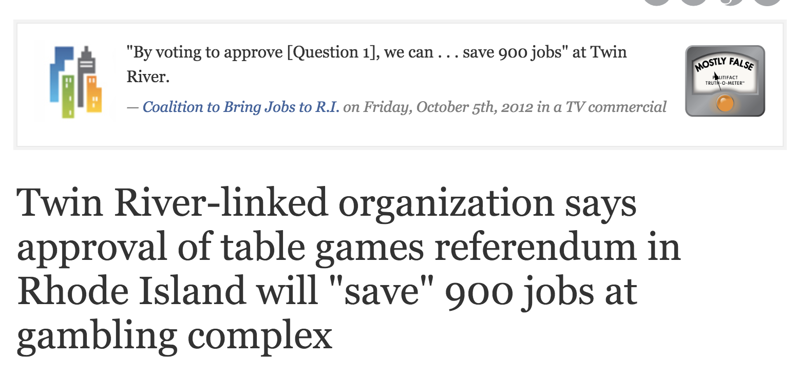 In the 2012 campaign, the Pulitzer Prize-winning website Politifact found that the Twin River’s campaign claims about jobs were “Mostly False.”