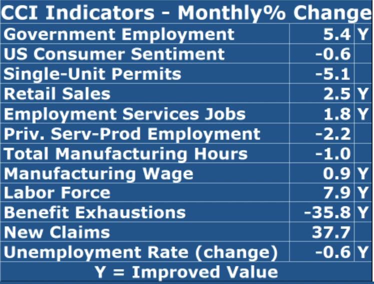 GET THE LATEST BREAKING NEWS HERE -- SIGN UP FOR GOLOCAL FREE DAILY EBLASTFor September, the Current Conditions Index rose from its revised August value of 75 to 83, as ten of the twelve CCI indicators improved. Part of our recent strength is the continuation of easy “comps” from last year. In spite of this, the CCI has remained in expansion territory since April, and hopefully will continue the broadening of the pace of our economy.