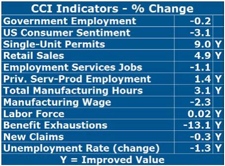 Retail Sales remained strong in May, rising by just under 5 percent compared to a year ago. This indicator has now improved for eleven of the last twelve months. Based on its recent performance, it is one of the strongest CCI indicators. Benefit Exhaustions, which reflects longer-term unemployment, improved at a double-digit rate in May (-13.1%), registering its second consecutive double-digit improvement.