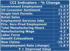 The two leading indicators that failed to improve last month reversed course in strong fashion. New home construction, in terms of Single-Unit Permits, rose by 21 percent compared to last August, after a large drop last month. This remains the most volatile of the CCI indicators. Total Manufacturing Hours, a measure of manufacturing sector strength, rose by 0.9 percent in August after falling by over one percent in July, ending a string of four consecutive declines. The remaining leading indicators within the CCI improved again in August. US Consumer Sentiment rose once again at a double-digit rate (+11.0%) for the eleventh consecutive month. Employment Service Jobs, which includes temporary employment and is a prerequisite to employment growth, improved by 5.1 percent, slower than last month but still very healthy. Finally, New Claims, a leading labor market indicator that reflects layoffs, fell by 10.7 percent in August, sustaining its well-defined downtrend.