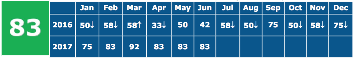 The Current Conditions Index for June was 83, as ten of the twelve indicators (83.3%) improved. As stated earlier, the higher CCI values we have been experiencing represent a sustained acceleration compared to last year, although the second quarter values last year weren’t that difficult to beat. Happily, we have now beat last year’s CCI value for each of the six months of 2017, which is an exceptionally rare accomplishment here. Better yet, assuming the employment data hold up, in May Rhode Island finally moved past its prior payroll employment peak.