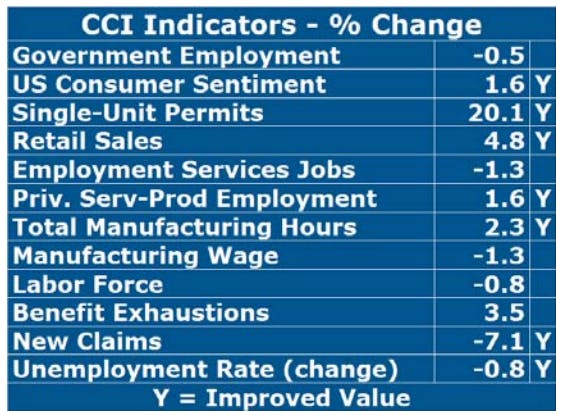 The present recovery continues to be less broadly based than it was a year ago based on the fact that the CCI has now failed to exceed its year-earlier value for eight consecutive months. Winter weather is no longer a possible explanation. While a number of areas continue to display strength, and can be expected to continue doing so in the coming months, it appears that our state’s cyclical negatives are gaining strength, which will dissipate our overall momentum. The critical question at present continues to be whether increasing nation- al economic momentum will be sufficient to help us fend off the ef- fects of our strengthening negatives.