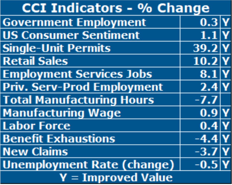 In spite of all the good news, our weakest area by far continues to be manufacturing. In December, Total Manufacturing Hours, a proxy for manufacturing output, fell for the fifteenth consecutive month (-7.7%), as both employment and the workweek both declined yet again. Even the Manufacturing Wage, while improving, grew at its slowest rate in a year (+0.9%). US Consumer Sentiment improved this month, but barely (+1.1%), its first improvement in the last five months. Single-Unit Permits, which reflect new home construction, surged (+39.2%) following an exceptionally easy comp a year ago. Long-term unemployment, based on Benefit Exhaustions, improved in December, but its recent performance remains weak. It is not certain whether this indicator will transition to a meaningful downtrend any time soon. Private Service Producing Employment, which reflects job change focusing on our service sector excluding government, rose by 2.4 percent in December. Its growth has exceeded a two percent rate each month since July. Government Employment increased again in December as it has for eleven of the past twelve months, sustaining a level above 61,000.