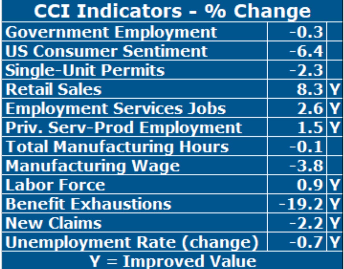 For November, seven of the CCI indicators improved. Individual indicator performances were far less weak than those in October. New Claims, the timeliest measure of layoffs, fell, albeit barely (-2.2%), its third decrease in the last six months. Hopefully layoffs might not trend higher after all. Rhode Island’s goods-producing sector’s performance was very bad again in November. Total Manufacturing Hours, a proxy for manufacturing output, an important part of Rhode Island’s recent strength, fell for a second consecutive month (-0.1%). The workweek lengthened but employment fell. The Manufacturing Wage declined again in November (-3.8%). Single-Unit Permits, which reflect new home construction, continued their recent string of declines (-2.3%), based on my estimate since its value was unavailable due to the government shutdown. Employment Service Jobs, a leading labor market indicator that includes temporary employment, improved (+2.6%) after failing to do so last month. US Consumer Sentiment fell in November (-6.4%), calling its recent uptrend into question.