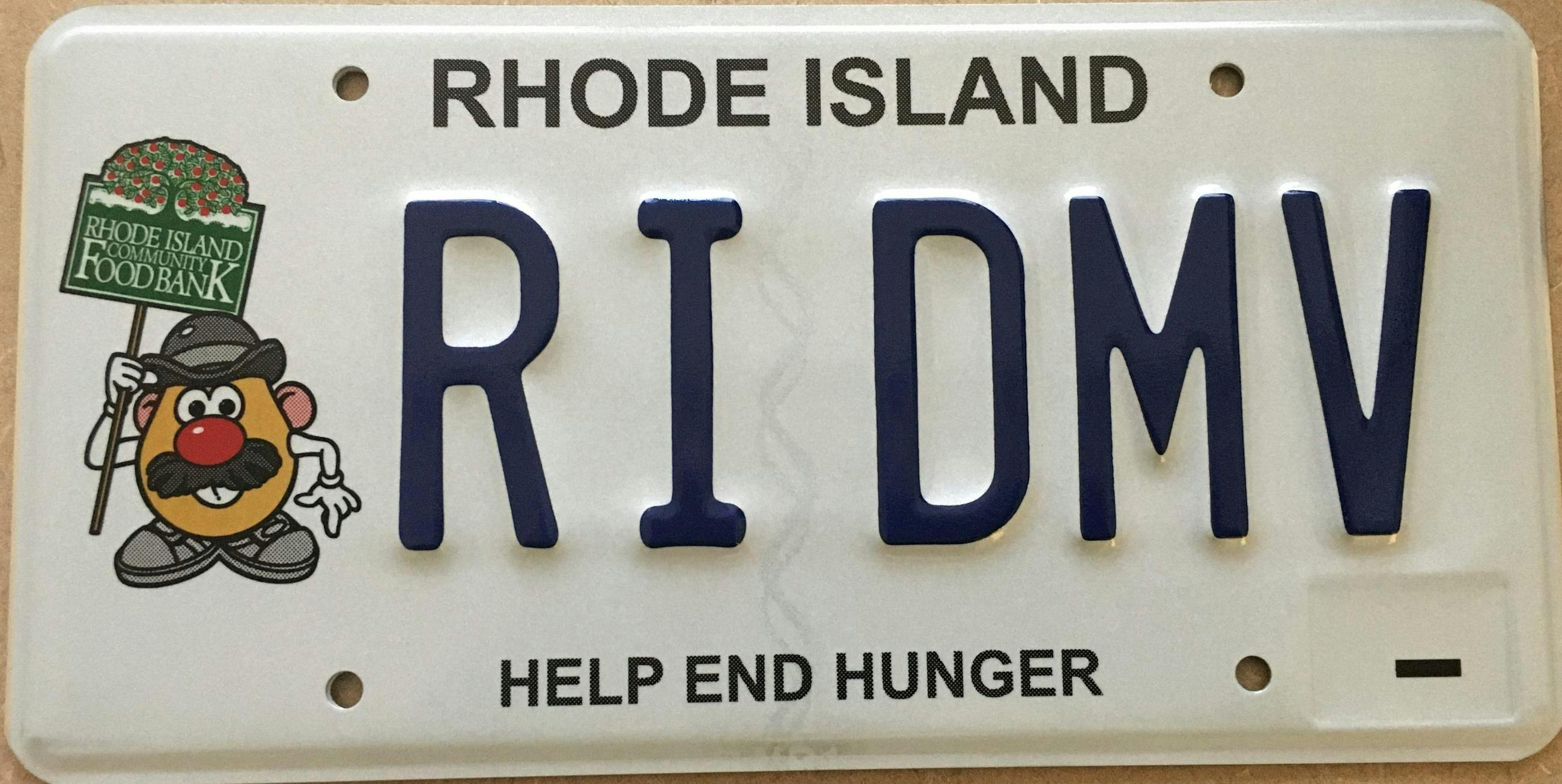 Of the few choices available to those who are not firemen, veterans, or recipients of the Purple Heart, there’s Plum Beach Lighthouse, Conservation Through Education, Providence College, Rocky Point, and so on. Then there’s a messy redesign of the Patriots tag, with a miniscule resume of the six Super Bowl victories. And there’s the old standby of the community food bank’s Help End Hunger, with its curious use of Mr. Potato Head–maybe a reference to the Irish Potato Famine, an event commemorated in this state.