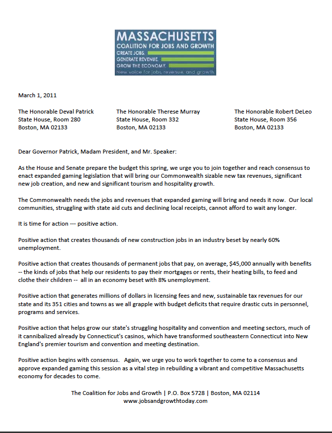 "The Commonwealth needs the jobs and revenues that expanded gaming will bring and needs it now. Our local communities, struggling with state aid cuts and declining local receipts, cannot afford to wait any longer.