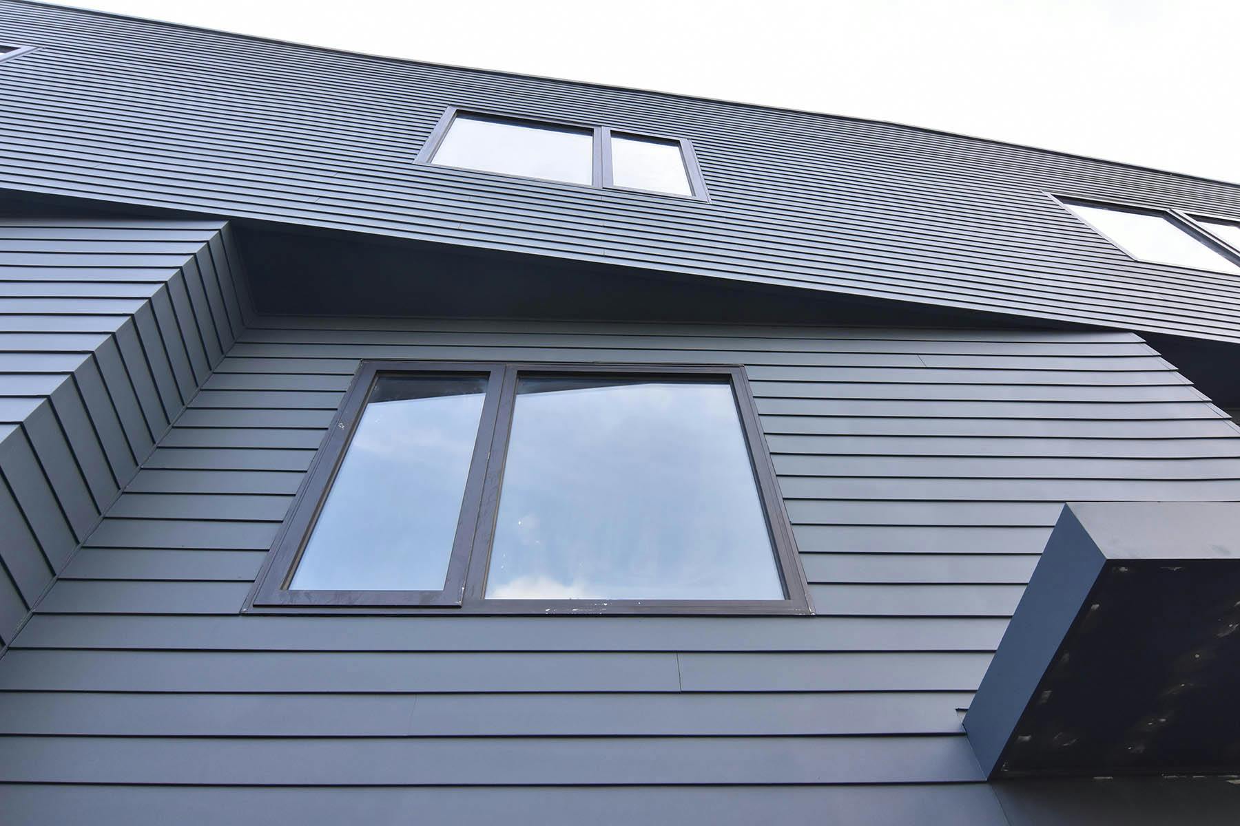 Ryan addressed why the townhouses look as they do. “The lower level is stepped back with each getting covered stoops, giving each unit its own articulation. The building is a long continuous plane that runs over the stepped unit entries below, with the rising and falling of the roof line coordinated with the rhythm of the rowhouses. I wanted the play between each unit having its own identity while also creating a building that reads as one long figure.”