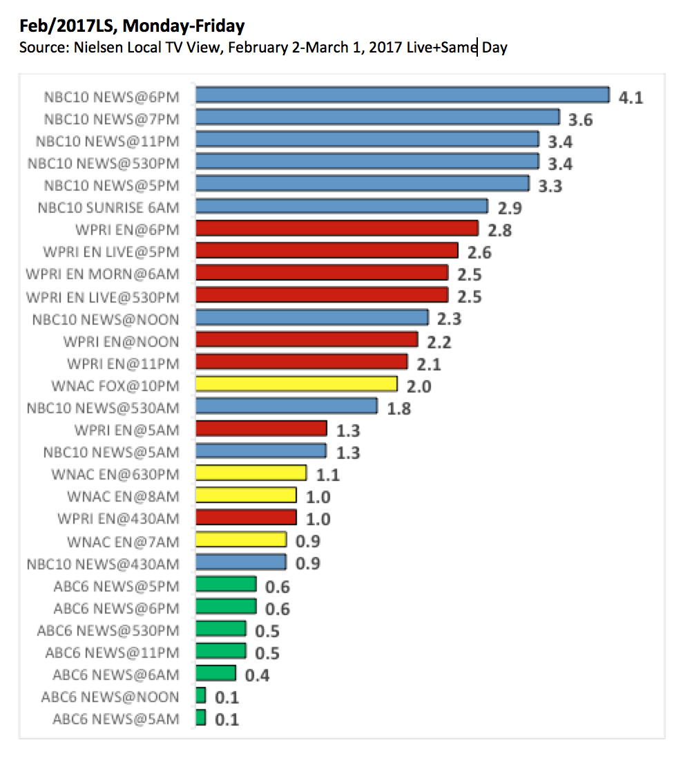The CBS affiliate, WPRI-12 fired right back, asserting its leadership in the all important morning newscasts. “During the February 2017 ratings period, Eyewitness News This Morning on WPRI 12 and Fox Providence was the #1 morning news at 4:30am, 5am, and 6am in household ratings in the Providence RI/New Bedford MA DMA, according to Nielsen. In the Late News, Eyewitness News at 10PM on Fox Providence along with Eyewitness News at 11PM on WPRI combined garnered the most household ratings in that daypart,” said WPRI.
