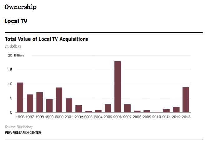 The Media General acquisition of LIN Media is just one of the latest big deals. Both 2013 and 2014 have seen a flurry of TV deals. “Local TV station sales exploded in 2013. Nearly 300 TV stations were sold, up 205% from 2012, according to BIA/Kelsey. Likewise, the total value of these transactions was up, a 367% increase in 2013 from 2012, reaching $8.8 billion,” report Pew Research in their State of the Media report for 2014.