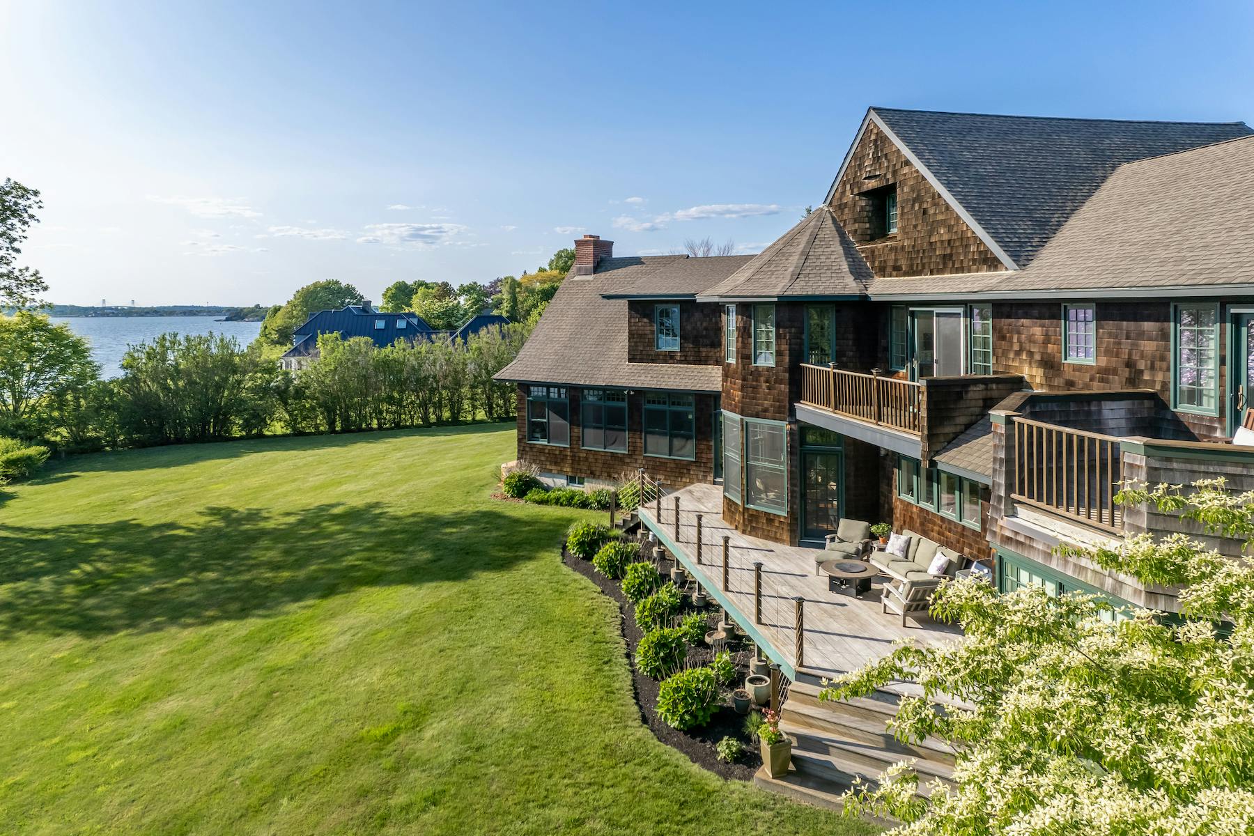 "Built with water views in mind, this custom Nantucket-style custom home sits high above the Sakonnet River where spectacular sunsets can be enjoyed and relaxation and entertaining are quintessential. With four bedrooms, four full bathrooms, and one-half bathroom, the open and airy home is ideal for family and friends," writes Mott & Chace.