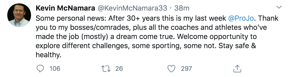 Some personal news: After 30+ years this is my last week @ProJo Thank you to my bosses/comrades, plus all the coaches and athletes who’ve made the job (mostly) a dream come true. Welcome opportunity to explore different challenges, some sporting, some not. Stay safe & healthy.