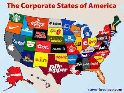 In this map, Lovelace selected a corporation or brand that best represented each state. The brand is based in that state and is still in business as of 2012. The map was inspired by Lovelace’s hypothesis that the power of nation states will significantly diminish as corporations and non-governmental organizations gain more power.