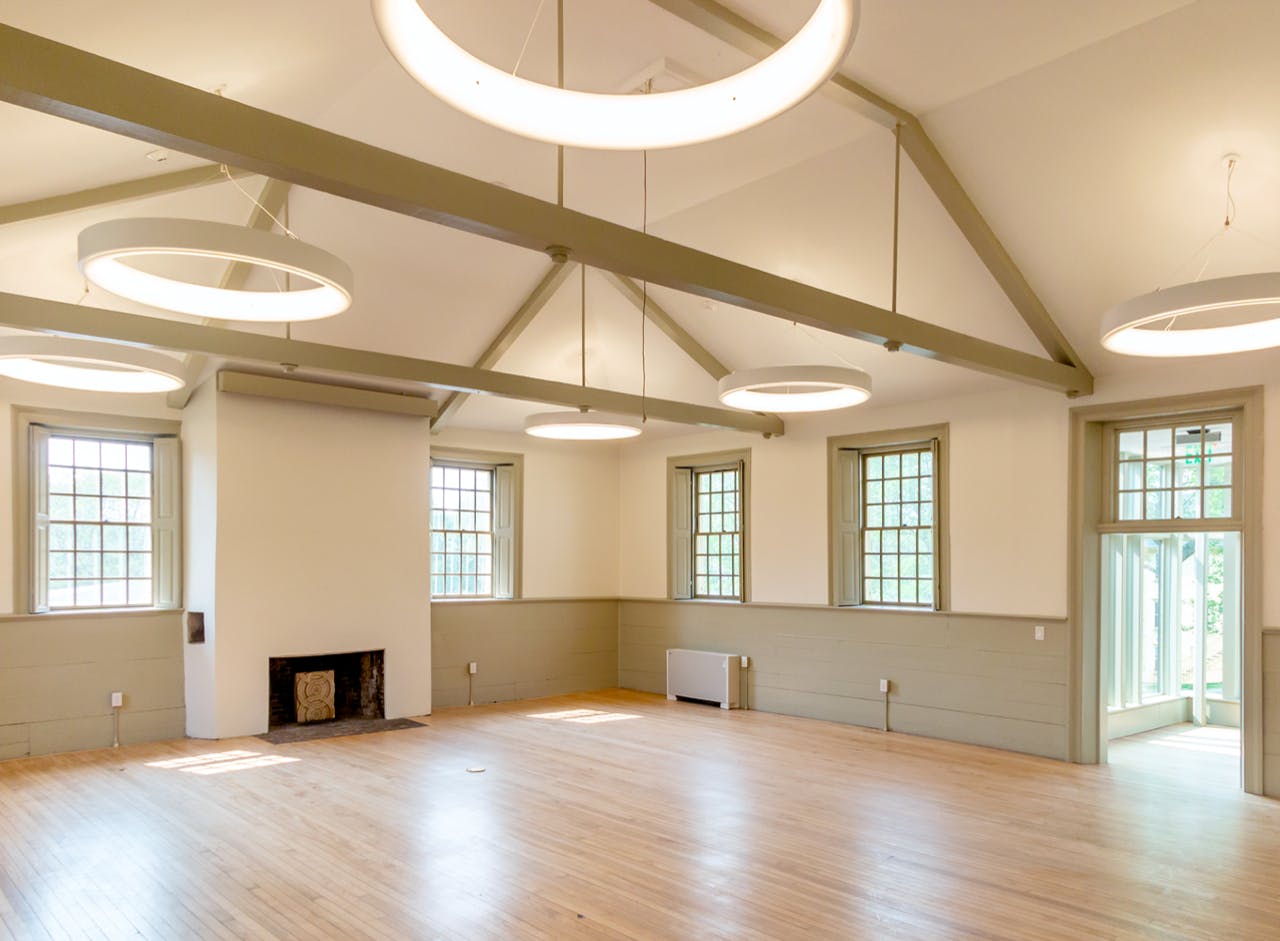 Landscape architect Colgate Searle designed the parking area behind the schoolhouse to collect runoff, an instance of the renovation team’s environmental responsibility. In fact, PPS gets high marks for the quality of everyone involved in the renovation. Besides Bell and Searle, the contractors were Site Specific, assisted by Odeh Engineers. The building needed multiple changes and improvements, but as Runyon states, “historic preservation is an inherently ‘green’ practice.” All systems are new, including a heat pump, a wood roof, and the interior reconfigured for optimal use. A new wall in the hallway recreates a divider that was there in the 18th Century, but reinstated it creates a larger working space for PPS staff. Upstairs,19th-century cast iron columns were removed from the main assembly room, while the wooden truss system from 1870 was restructured.