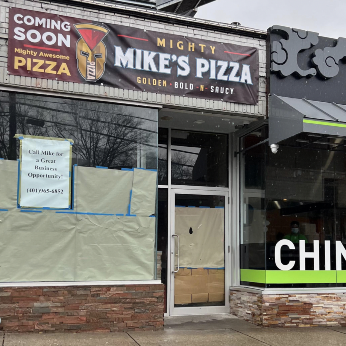 “Mike’s Pizza” has a sign advertising it is “coming soon” to the storefront where the Army-Navy Store used to be.