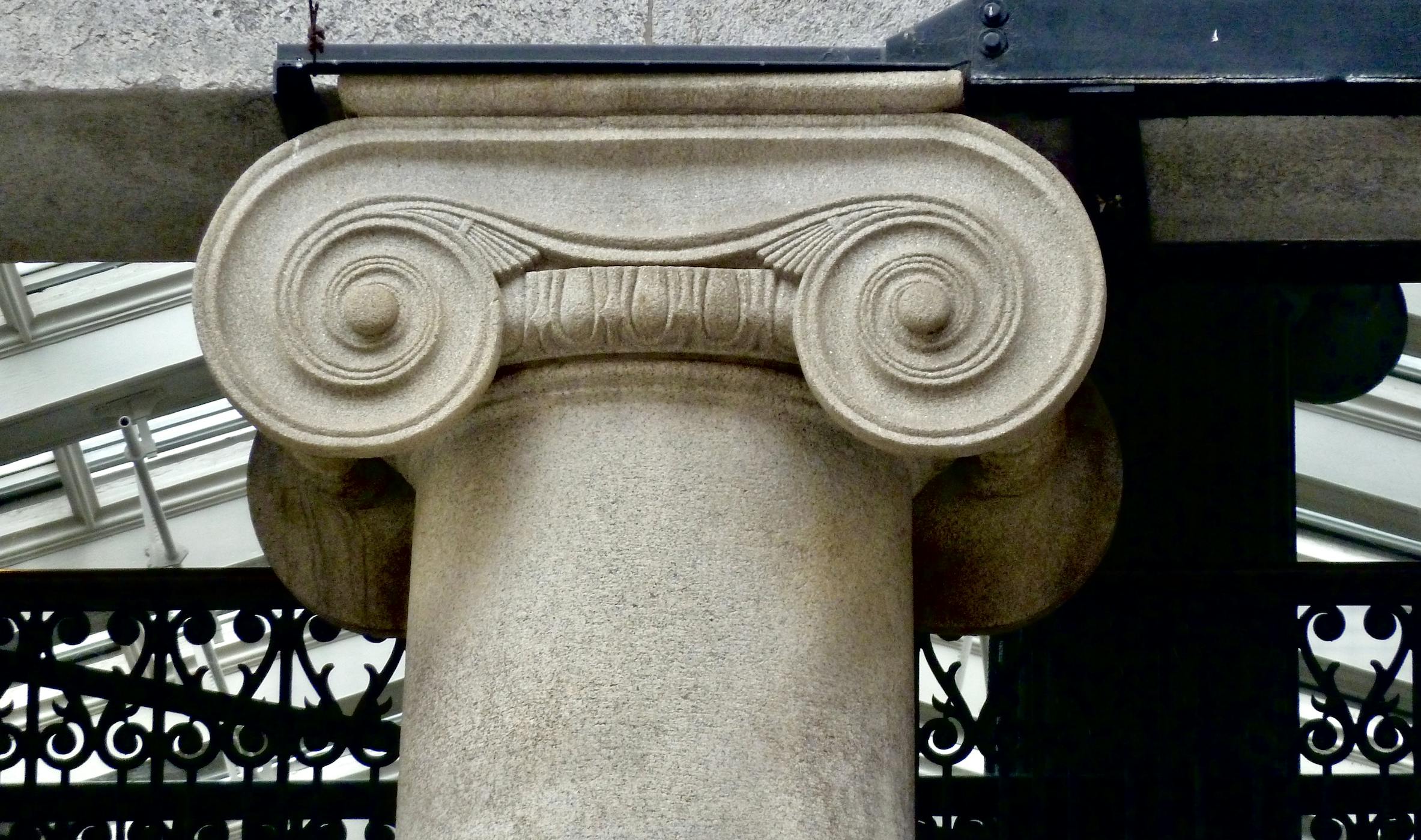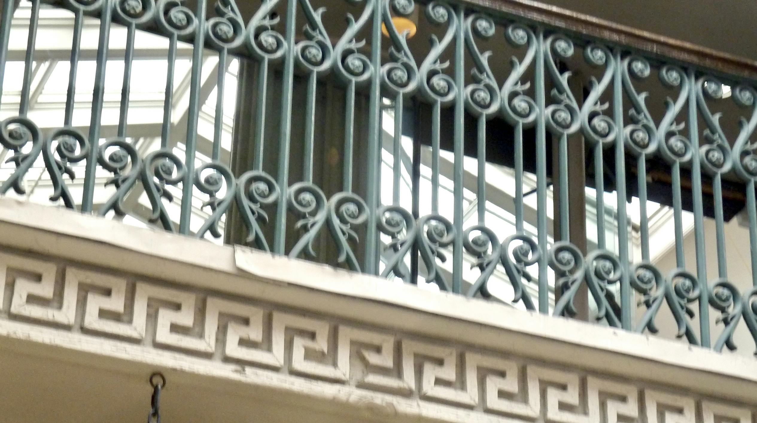 A Greek fret runs around the wall, while the railings fronting the interior walkways offer a delicate contrast to the massive stone columns outside.