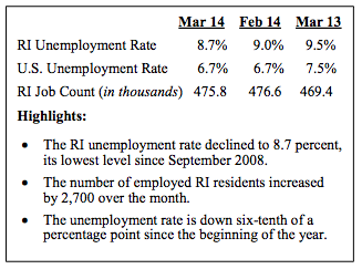 Rhode Island’s seasonally adjusted unemployment rate for March 2014 dropped to 8.7 percent, down three-tenths of a percentage point from the February 2014 rate and down eight-tenths of a percentage point from the March 2013 rate, according to numbers released by the The RI Department of Labor and Training on Thursday.