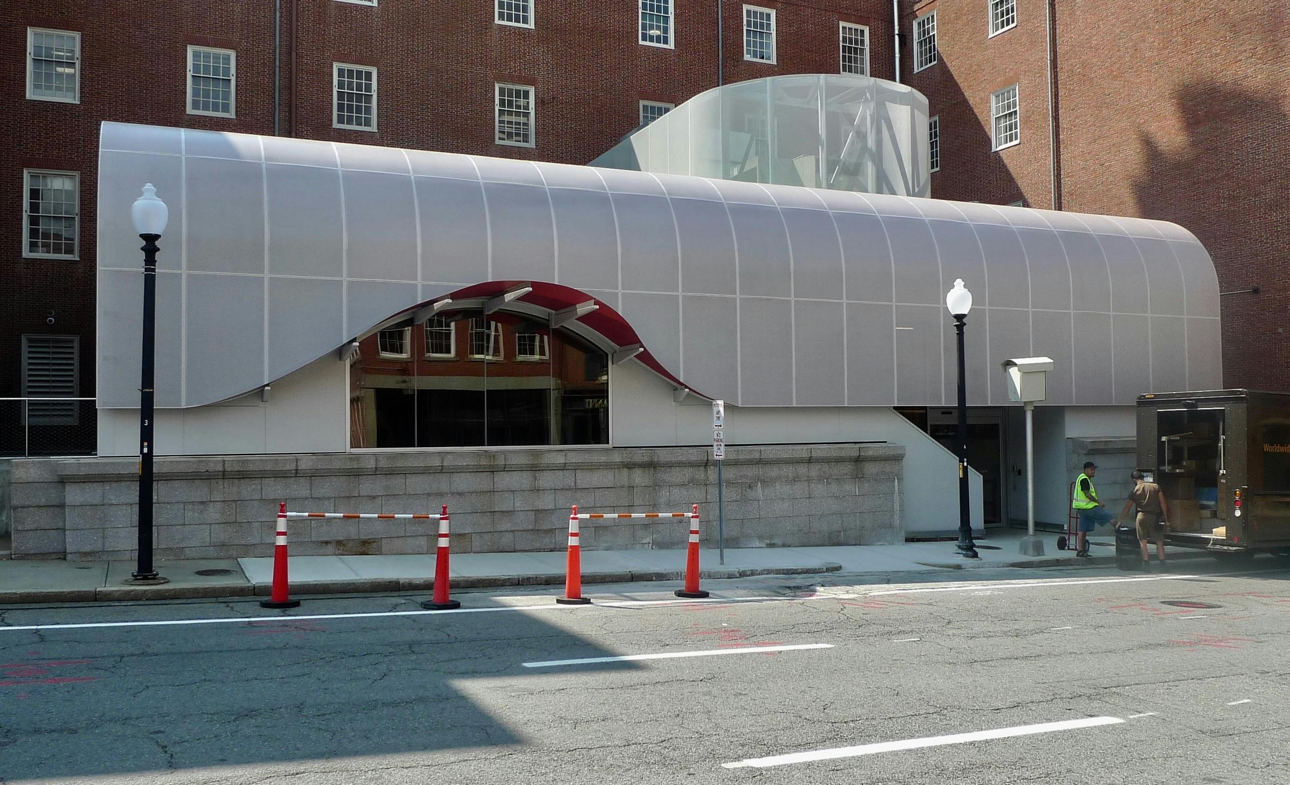 This curving metal-screen on Steeple Street is distinctive, but it makes no attempt to acknowledge the brick mass behind it.