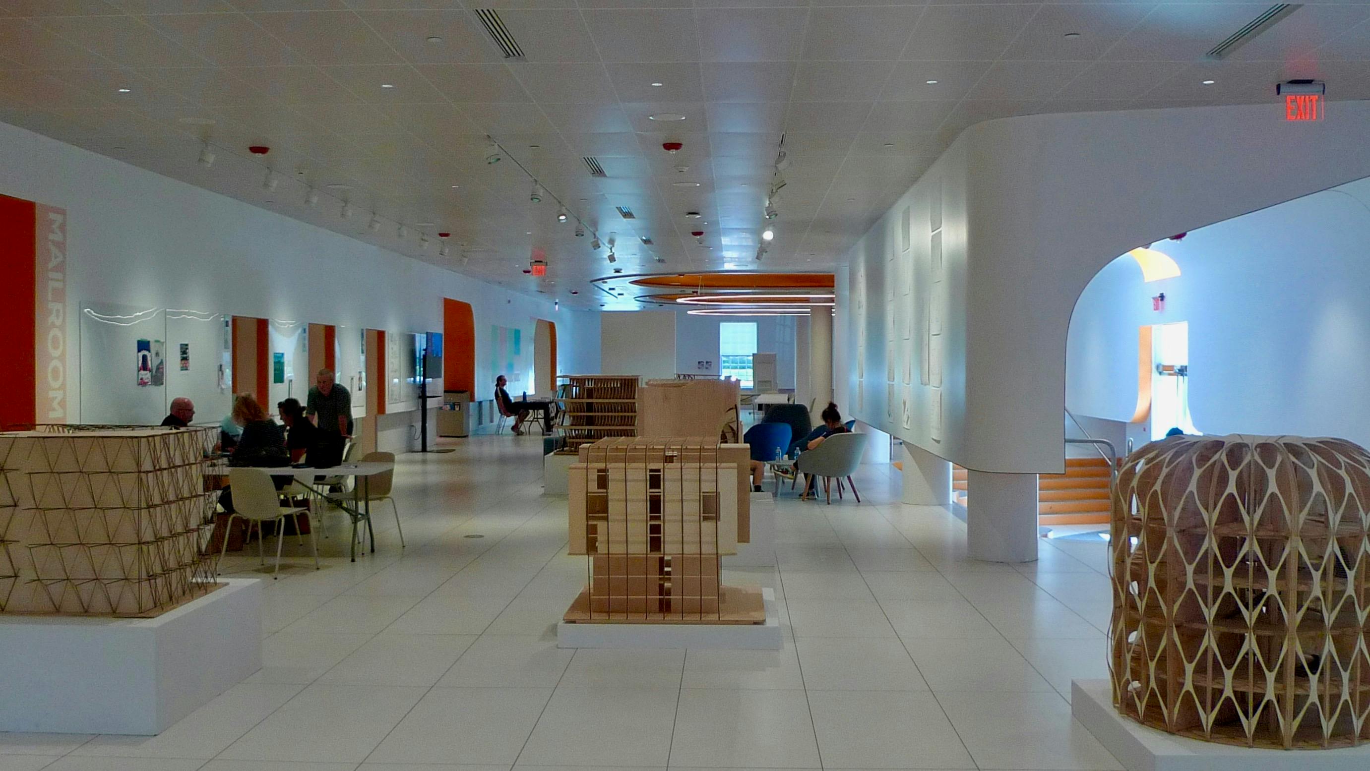 Curtains can divide the space, but they do not block out the hard-surfaces-enhanced noise, making the lobby less than ideal for meetings or crits.