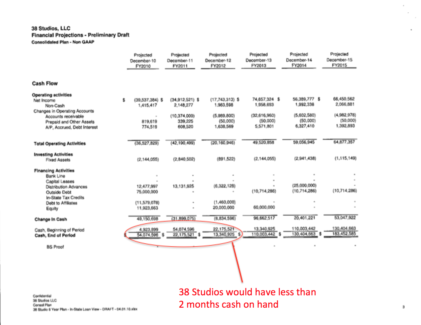 According to 38 Studios' own projections, even with the infusion of $75 million, 38 Studios’ cash position (if all stayed on schedule with the production and marketing of the games) would dwindle to just $13 million at a time that expenses would rise to $75.1 million in FY 2012. The company would have less than two months operating cash.