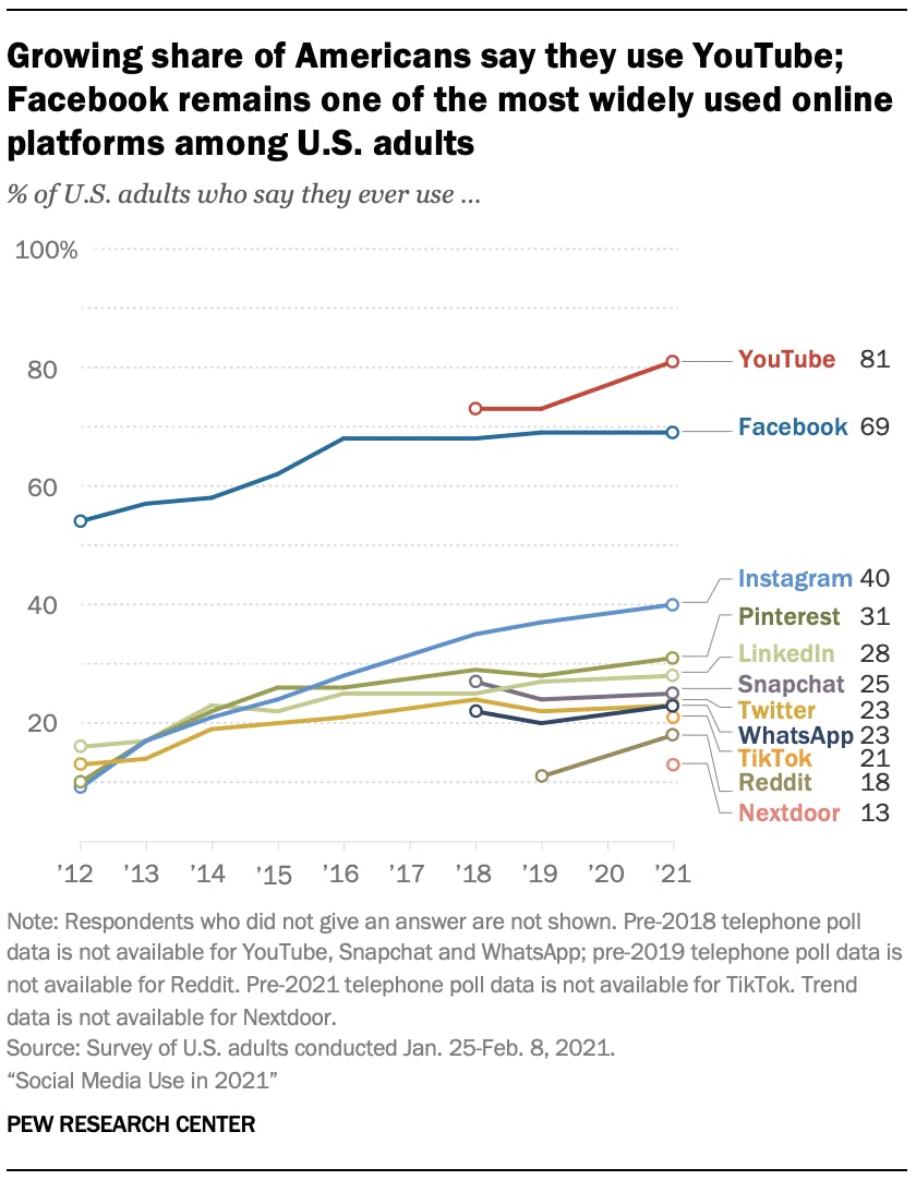 "Majorities of 18- to 29-year-olds say they use Instagram or Snapchat and about half say they use TikTok, with those on the younger end of this cohort – ages 18 to 24 – being especially likely to report using Instagram (76%), Snapchat (75%) or TikTok (55%)," according to Pew. "These shares stand in stark contrast to those in older age groups. For instance, while 65% of adults ages 18 to 29 say they use Snapchat, just 2% of those 65 and older report using the app – a difference of 63 percentage points."