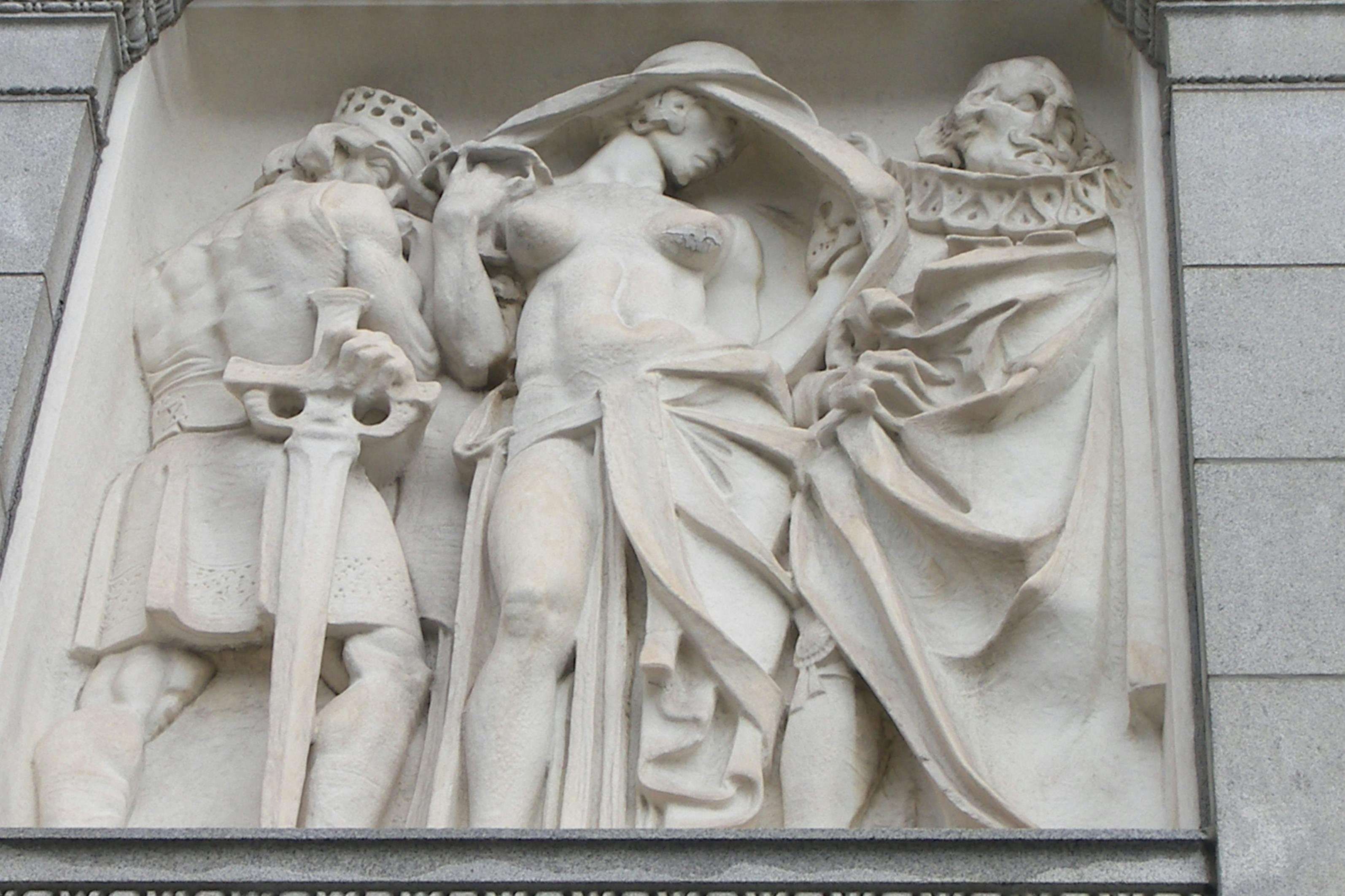 More in the spirit of the era is the decorative panels above the main windows. These depict the march of civilization: the ancient world of Egypt, Greece, and Rome, along with Shakespearean and Wagnerian heroes. These represent the first major work of Lee Lawrie, who went onto fame as the chief sculptor at Rockefeller Center in New York–everyone knows his “Atlas” and the god-like “Wisdom” over the entrance to 30 Rock.