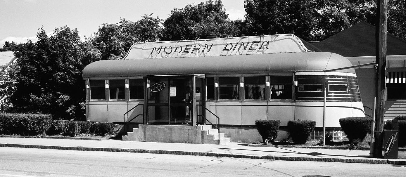 Pawtucket’s best-known example of Depression Deco style is the Modern Diner, with its automotive and airplane-derived streamlining. Even though re-located from downtown, its r glass block cowcatcher and curved prow still cut through the wind.