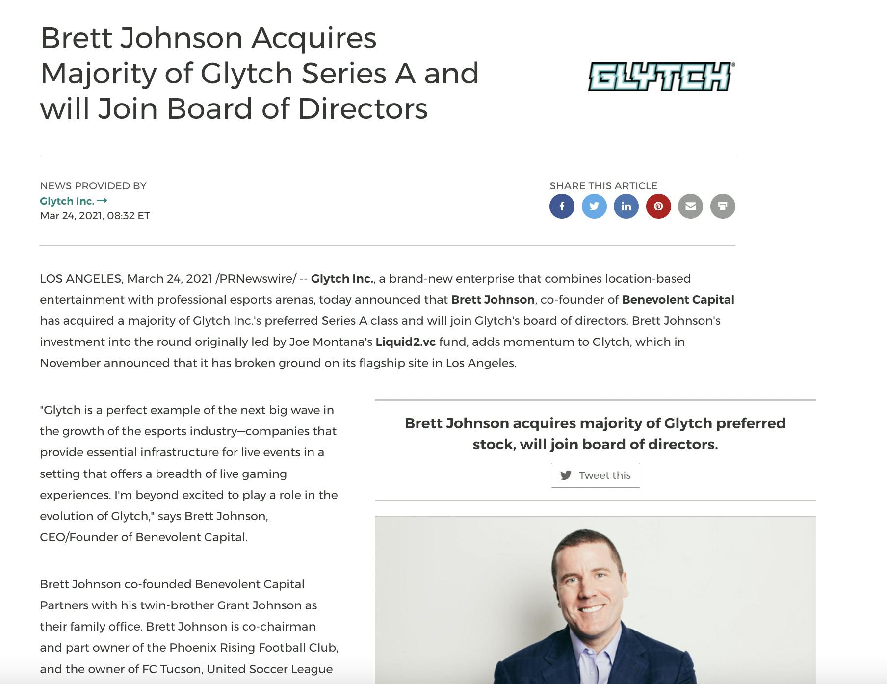 In March of 2021, Johnson issued a press release on PR Wire, and the headline read, “Brett Johnson Acquires Majority of Glytch Series A and Will Join Board of Directors.”