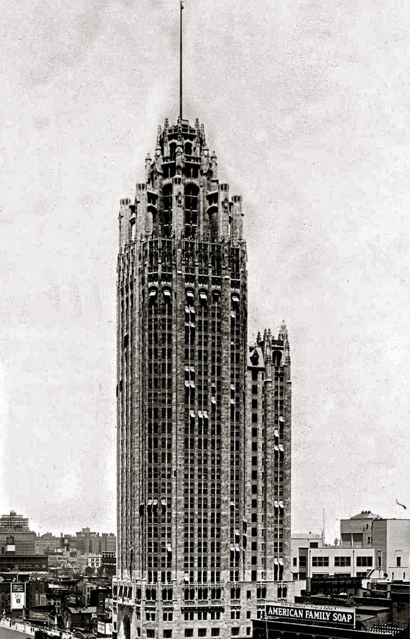 Chicago Tribune Tower, Hood & Howells, 1922-25, the result of a worldwide competition