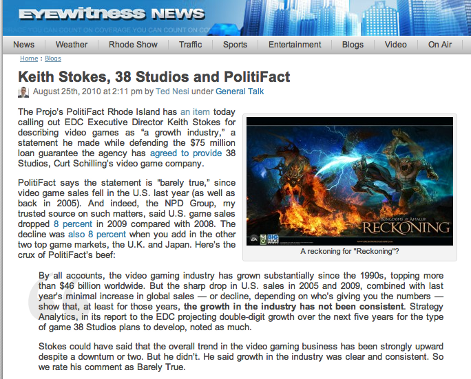 The Providence Journal fact finders, as noted in a WPRI.com column by Ted Nesi, flagged the Projo's ranking - "PolitiFact says the statement is “barely true.” The PolitiFact reviewers gave guidance to Stokes and the other 38 Studios lobbyists, "Stokes could have said that the overall trend in the video gaming business has been strongly upward despite a downturn or two." The designation of the "true" ranking helped to support the RIEDC's claim that the company was in a growth industry.