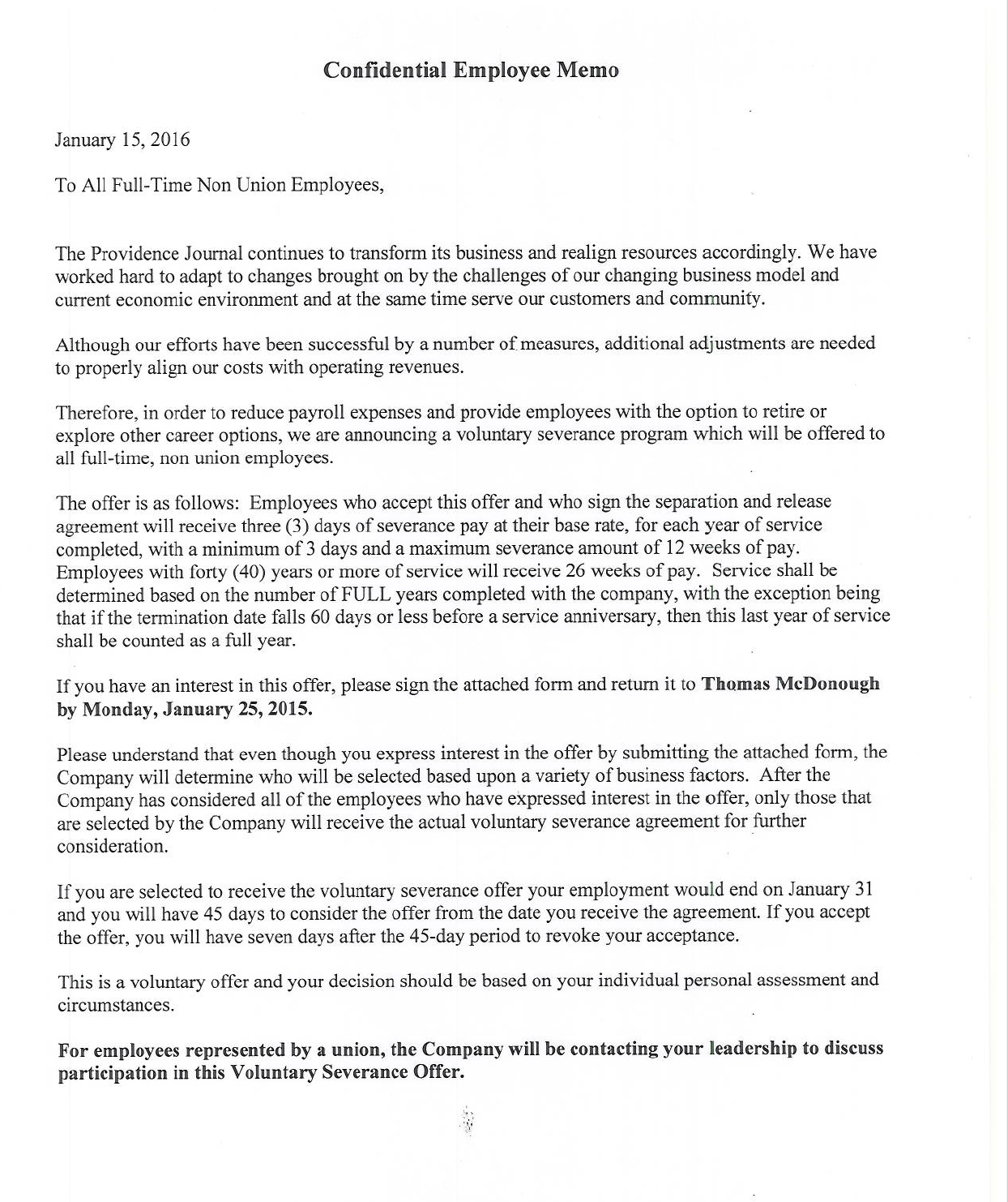 The letter goes on to identify the need to cut payroll costs, "Therefore, in order to reduce payroll expenses and provide employees with the option to retire or explore other career options, we are announcing a voluntary severance program which will be offered to all full-time, non union employees."