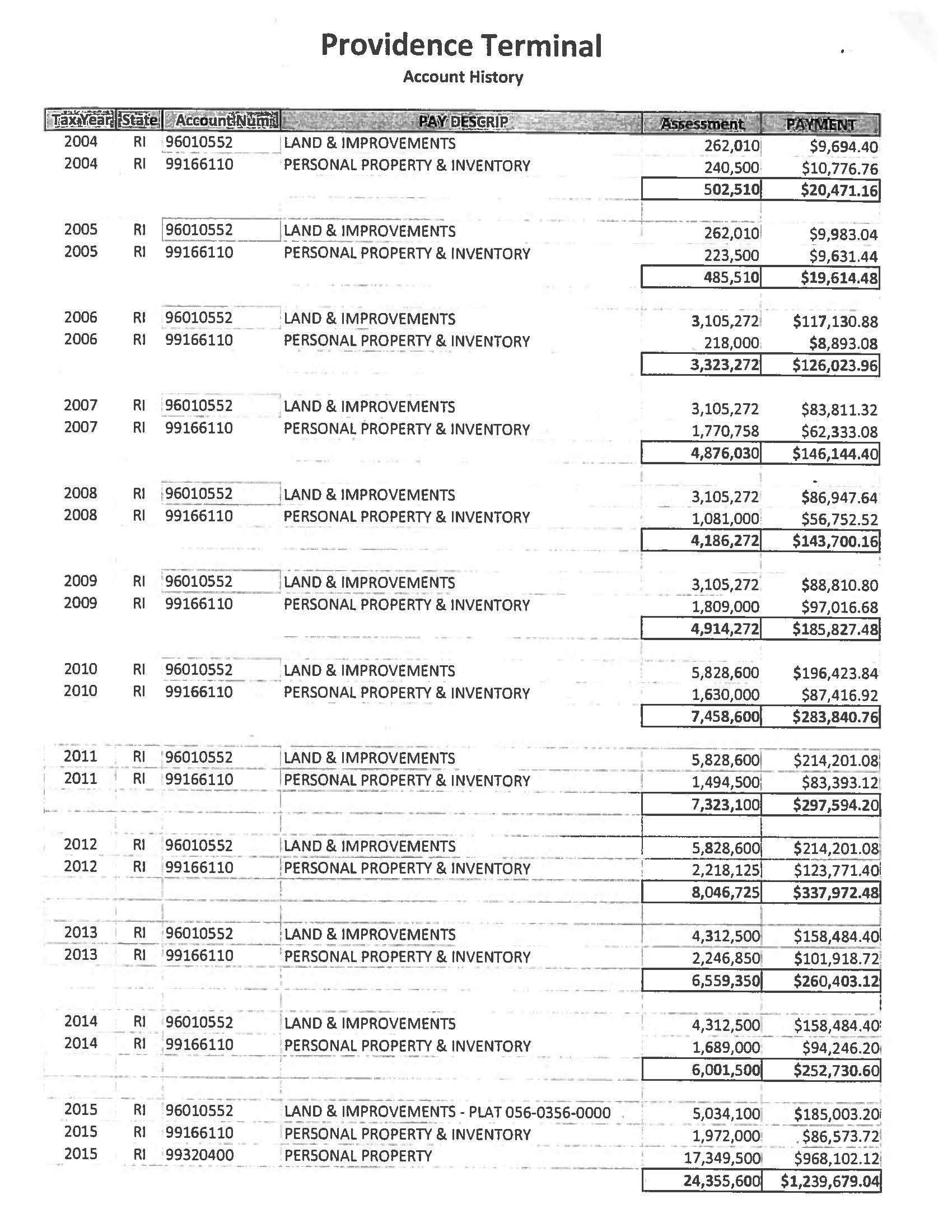 As GoLocal originally reported, the company was assessed and billed $1.2 million in taxes (SEE TAX SCHEDULE BELOW) which represented an almost 400-percent increase.