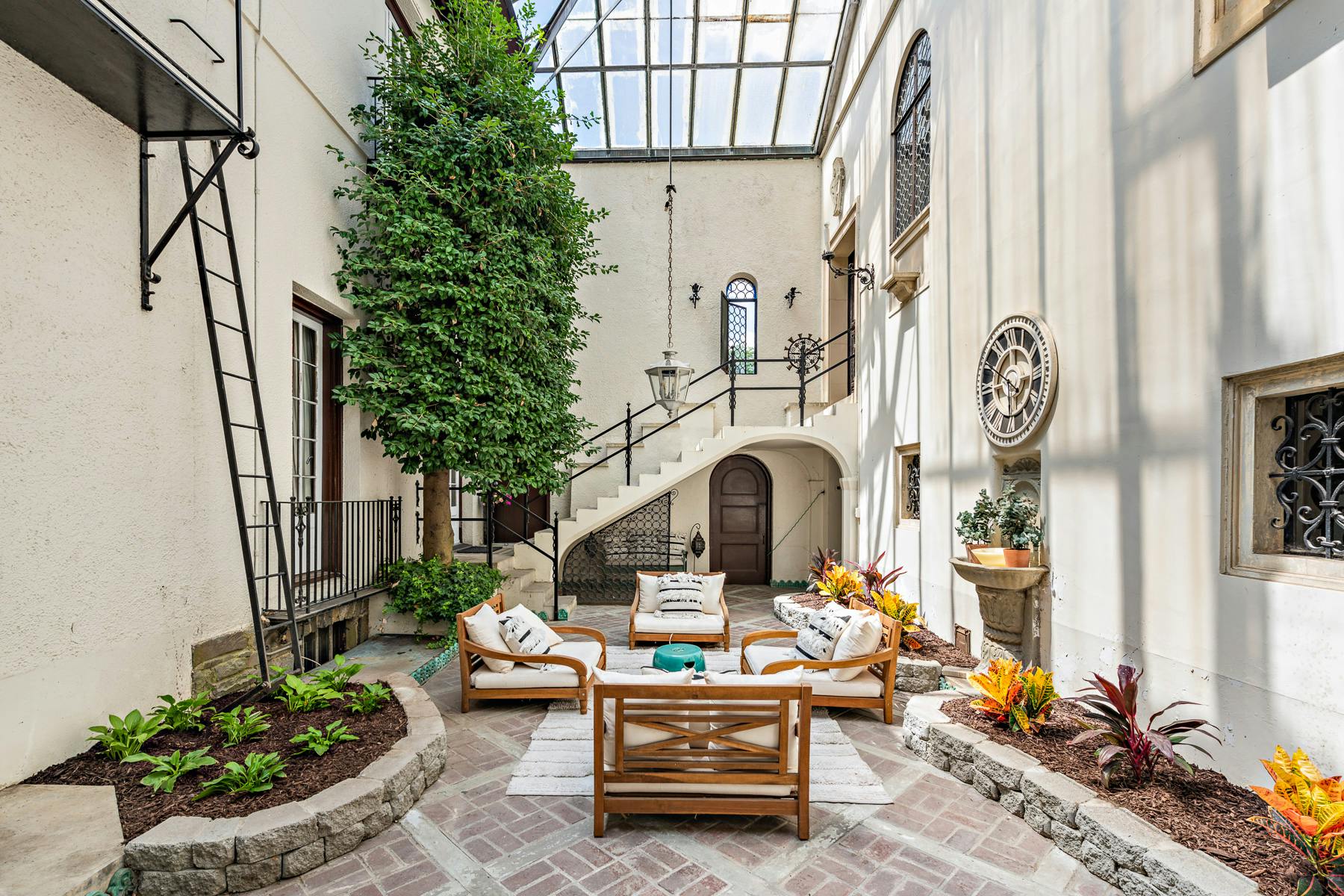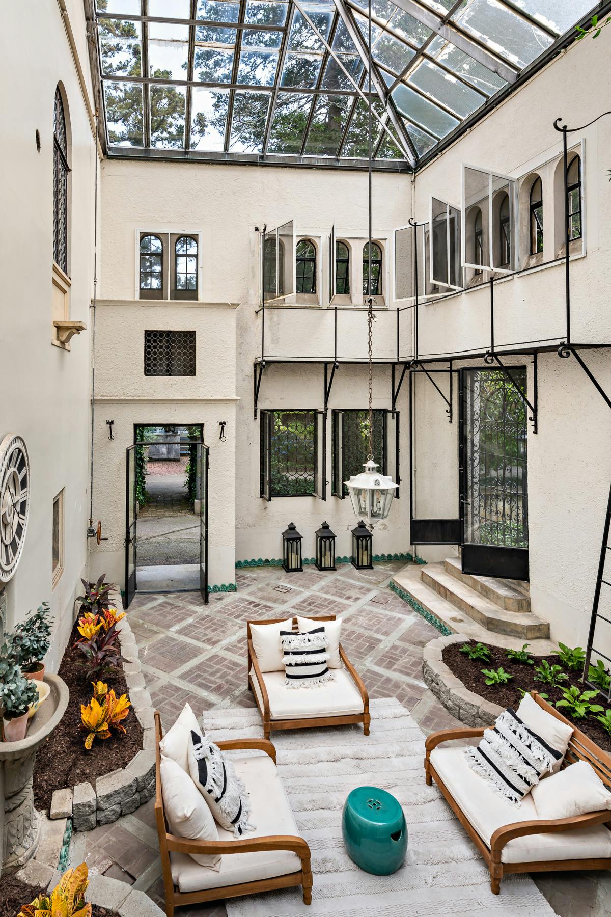 Step beyond the grand dining room of the main house, into an incredible indoor atrium, added in 1937, which provides for another delightful protected outdoor space for lounging, working, relaxing, or entertaining.