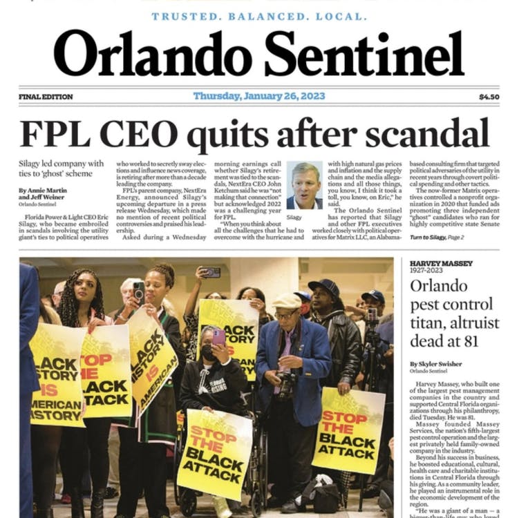 A series of reports in the Miami Herald, The Lever, ProPublica, and The Guardian has tracked millions of dollars in donations from NextEra to Florida Governor Ron DeSantis, Florida Republicans, GOP election deniers in Congress, and allegations of dark money fueling political dirty tricks.