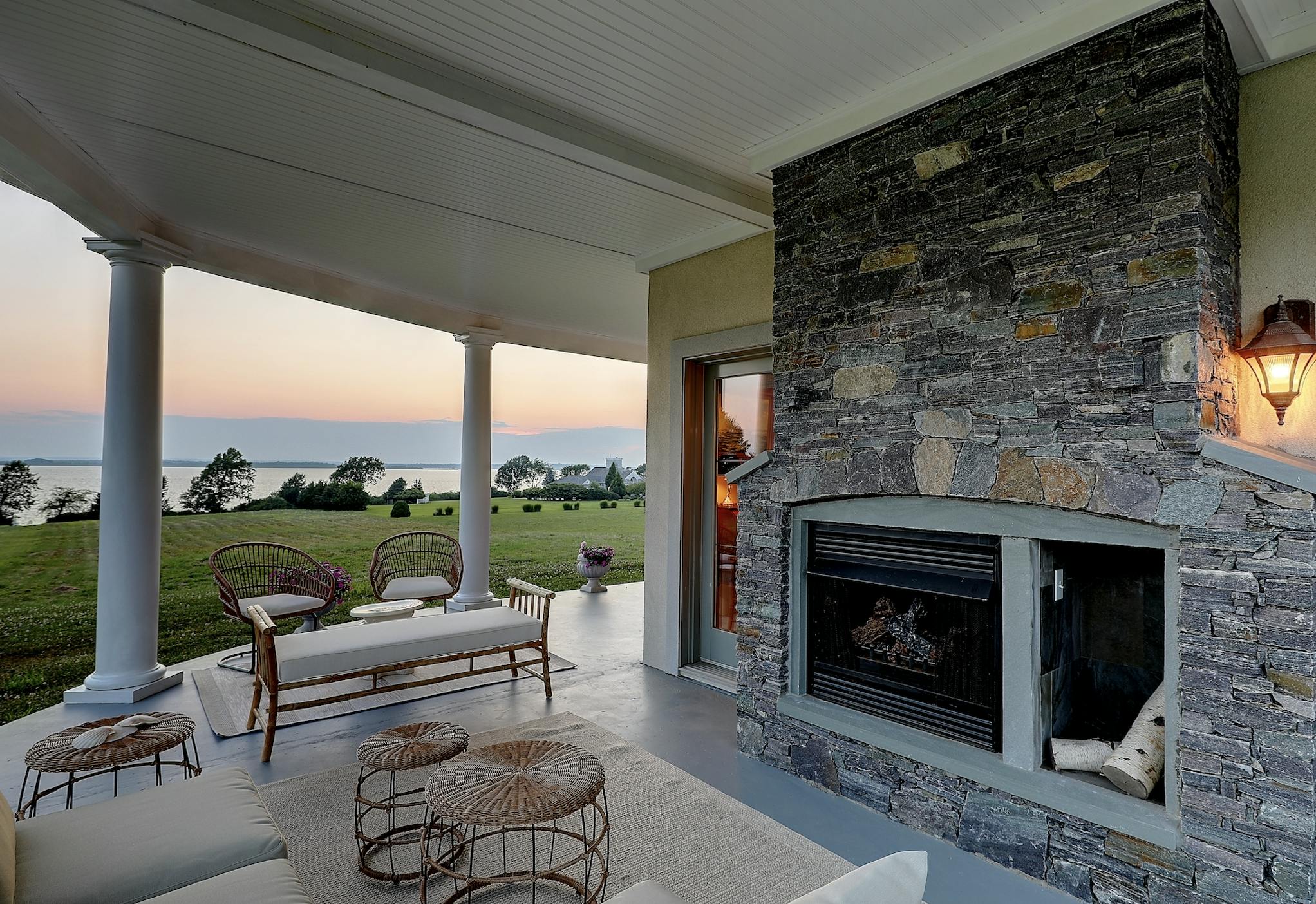 Multiple French doors open to a gorgeous wrap-around covered patio featuring an impressive stone fireplace.