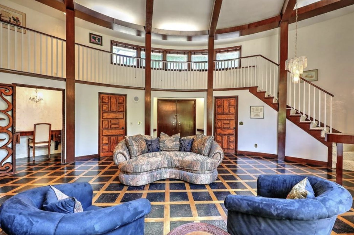 Featured in Architectural Digest in 1958, this stunning mid-century modern masterpiece showcases many design features popular in the period. The graceful, rounded entry way invites you into a salon with 15' ceilings. Floor to ceiling windows with carved wood panels allows light to stream in, casting artful shadows along the rich wood floors that flow throughout the space. To the left is a family room with a fireplace and custom cocktail bar. To the right, a vintage powder room.