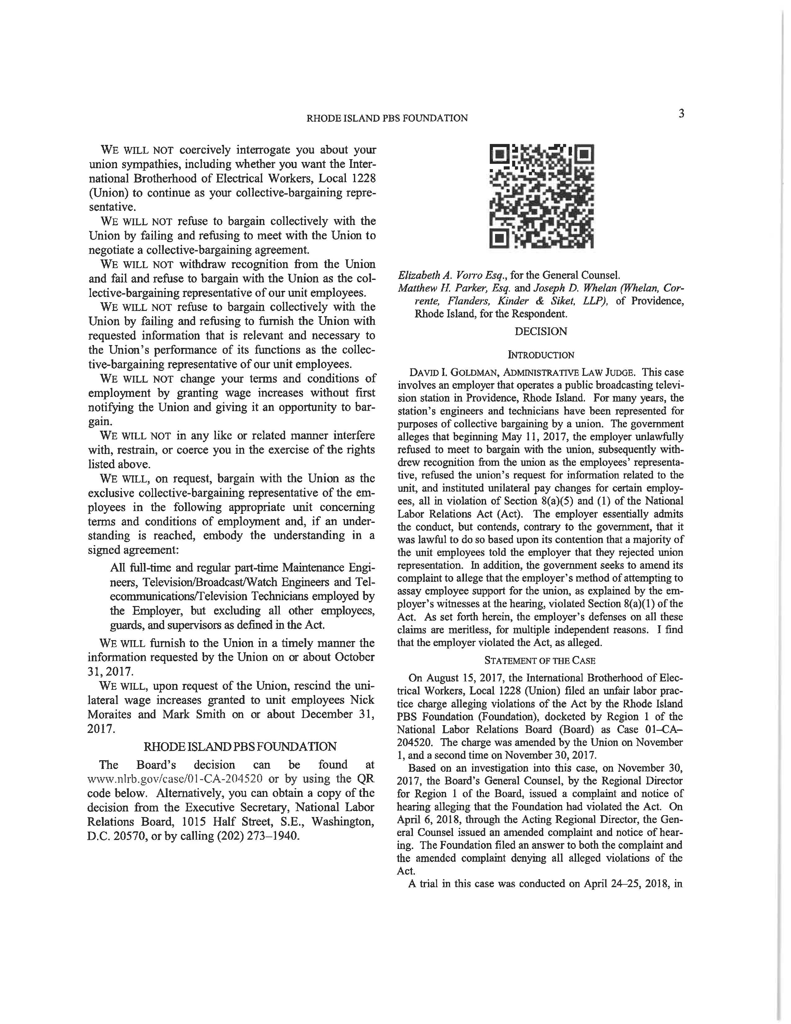 The decision orders RI PBS to fairly negotiate with the International Brotherhood of Electrical Workers, Local 1228.