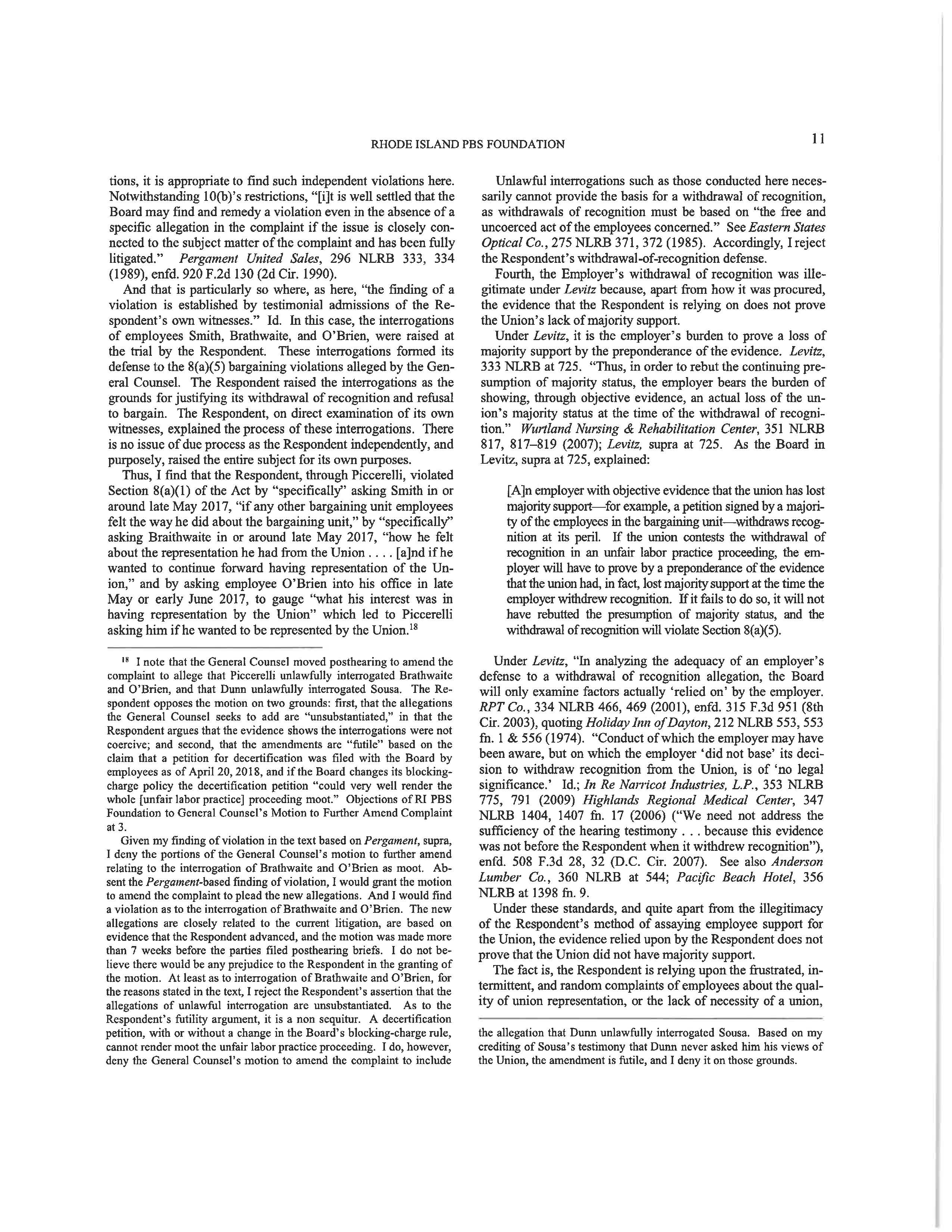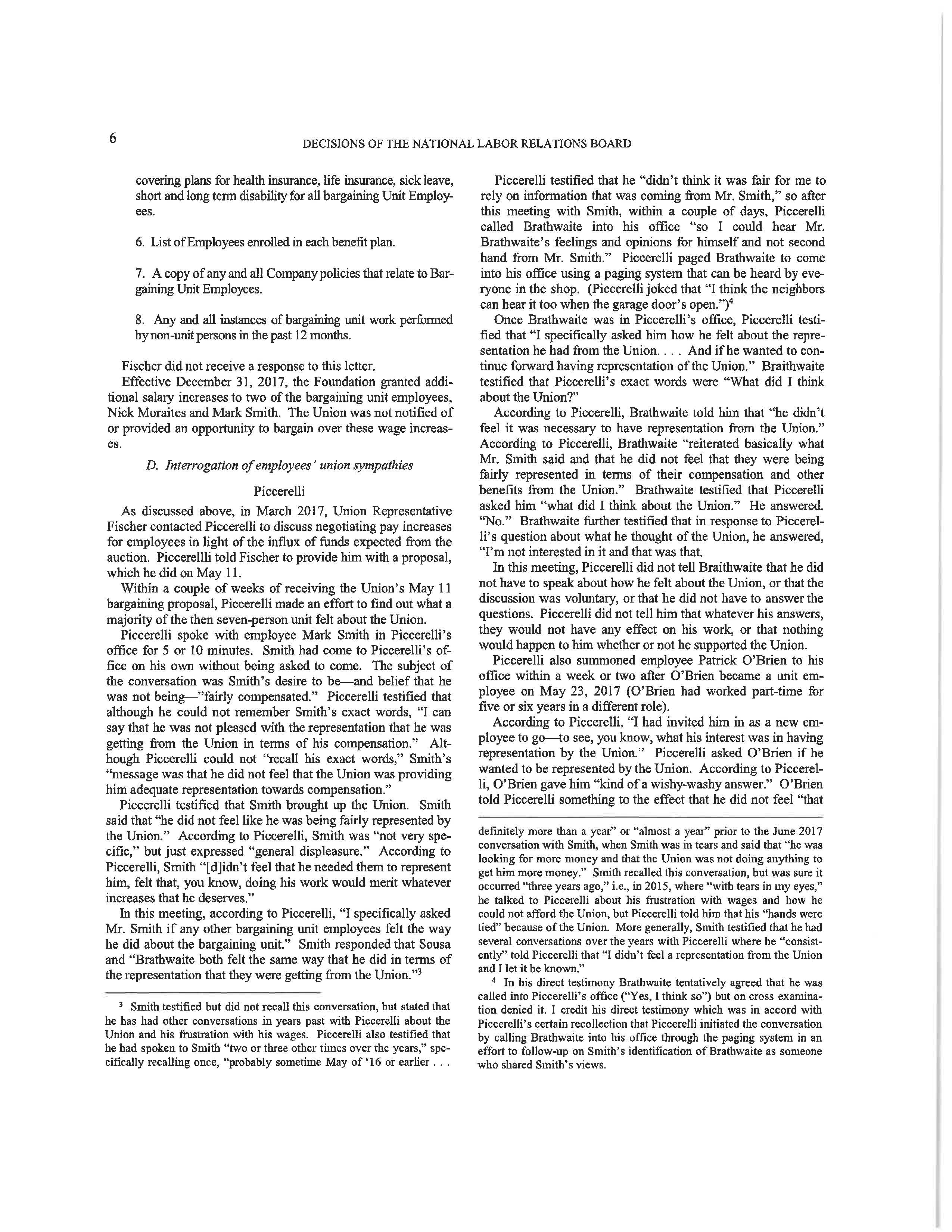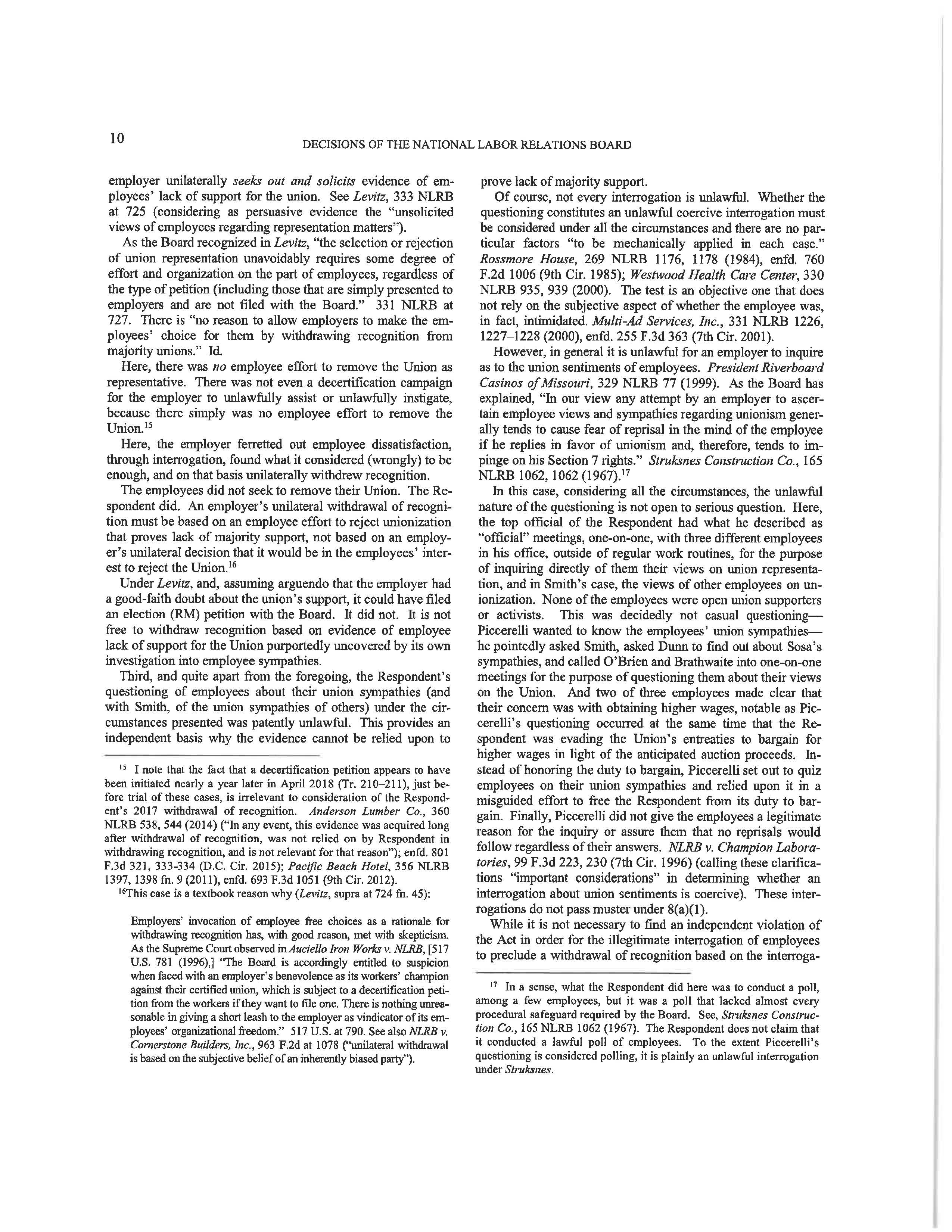 The NLRB decision found, "In this case, considering all the circumstances, the unlawful nature of the questioning is not open to serious question. Here, the top official of the Respondent had what he described as "official" meetings, one-on-one, with three different employees in his office, outside of regular work routines, for the purpose of inquiring directly of them their views on union representation, and in Smith's case, the views of other employees on unionization. None of the employees were open union supporters or activists. This was decidedly not casual questioningPiccerelli wanted to know the employees' union sympathies..."