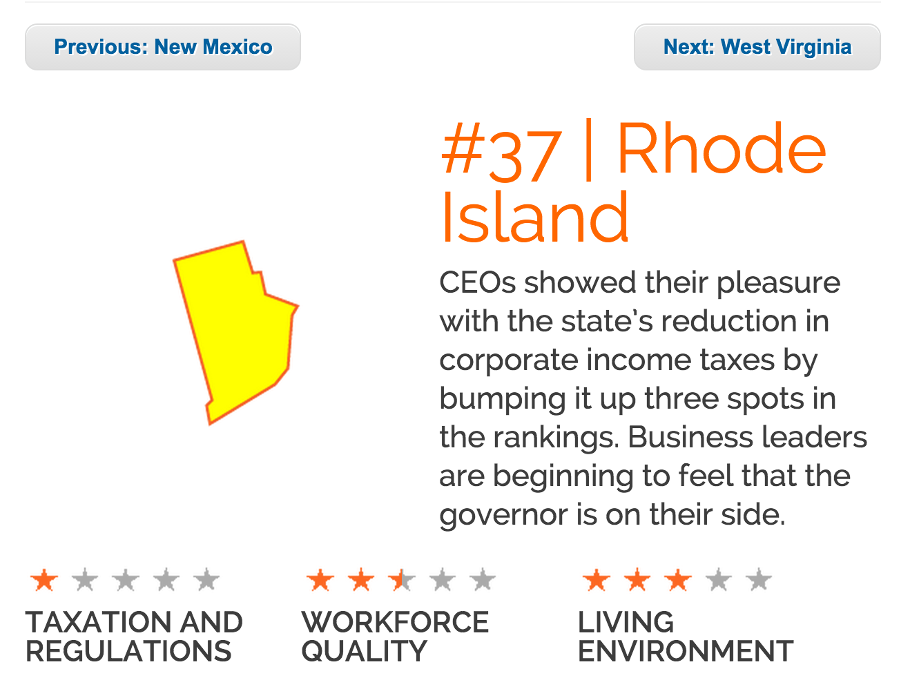 Certainly being ranked in the bottom half of the states is never good, but this might be the first time in years that RI’s ranking was not in the bottom 10 (or usually the bottom 3 - see below). “CEOs showed their pleasure with the state’s reduction in corporate income taxes by bumping it up three spots in the rankings. Business leaders are beginning to feel that the governor is on their side,” said CEO Magazine. Rhode Island improved three spots to #37.