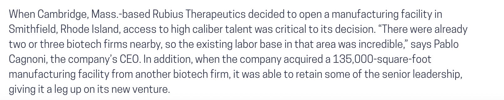 “When Cambridge, Mass.-based Rubius Therapeutics decided to open a manufacturing facility in Smithfield, Rhode Island, access to high caliber talent was critical to its decision. ‘There were already two or three biotech firms nearby, so the existing labor base in that area was incredible,’ says Pablo Cagnoni, the company’s CEO. In addition, when the company acquired a 135,000-square-foot manufacturing facility from another biotech firm, it was able to retain some of the senior leadership, giving it a leg up on its new venture,” states the Commerce Corp website.