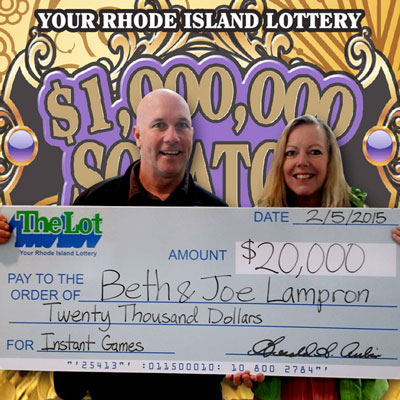 Beth and Joe Lampron of RumfordThe Rhode Island Lottery has announced that Beth and Joe Lampron of Rumford won $20,000 after deviating from their usual routine. Joe normally buys just PowerBall® tickets, but he started to mix things up, and asked for two $10 Instant Tickets. Then, a week later, while he was cooking dinner, he asked Beth to pick up two more $10 Instant Tickets. She went to Town Wine & Spirits, 179 Newport Ave., East Providence, and decided to instead ask for one $20 ticket. At home, she scratched off the first ten numbers, to reveal $1,000 prizes for each number. Joe scratched off the second half of the ticket with the same result. They told Lottery staff that as they totaled up the prizes, "We jumped up and down like Tom Brady at the end of the Superbowl!" They plan to use the money to pay bills, and then spoil their children and dogs.