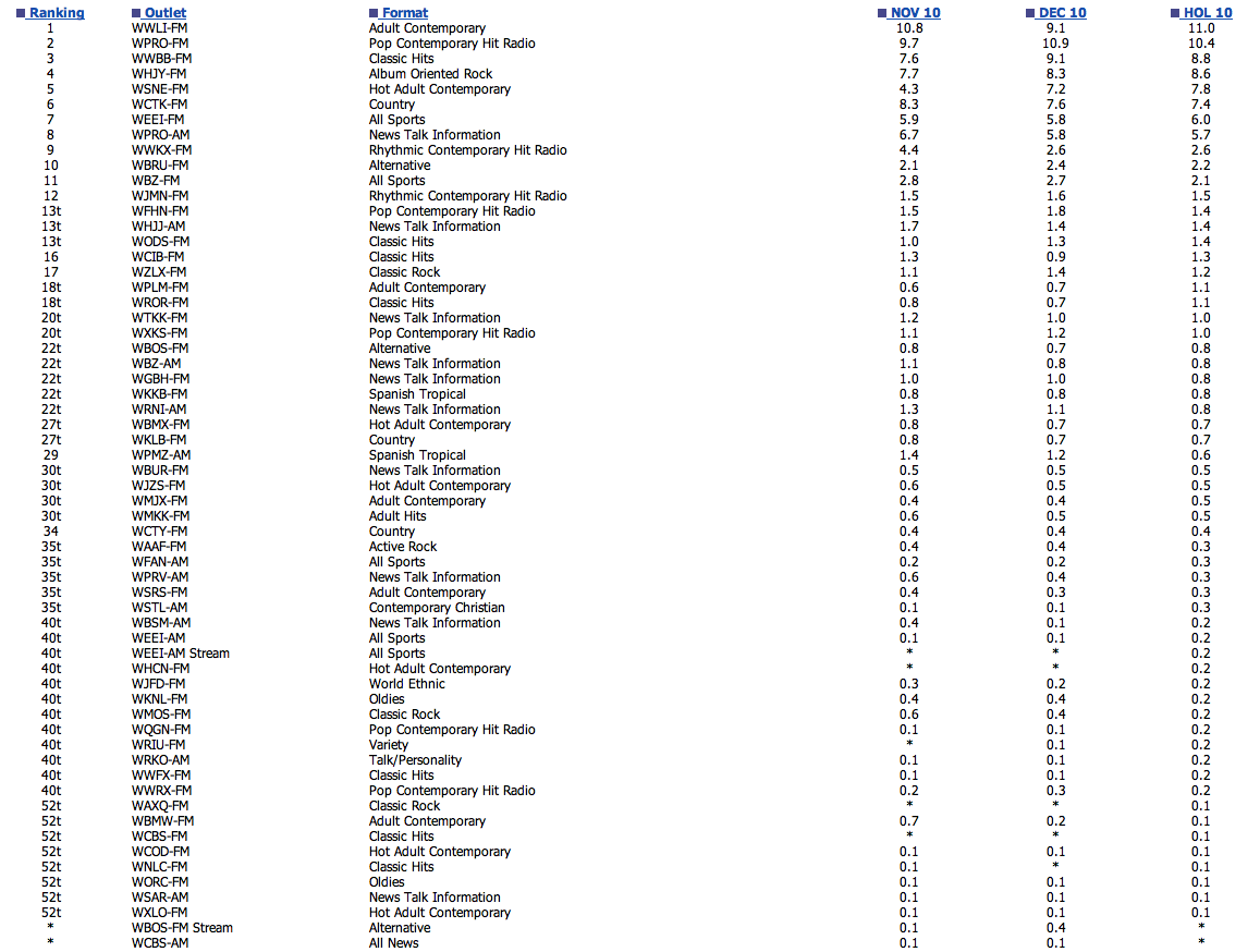 The radio ratings are unforgiving and there are winners and losers. Providence radio is ranked 41st in the country. New York City is ranked #1 and Los Angeles #2 to give you a sense as to where Providence is as it relates to market size.