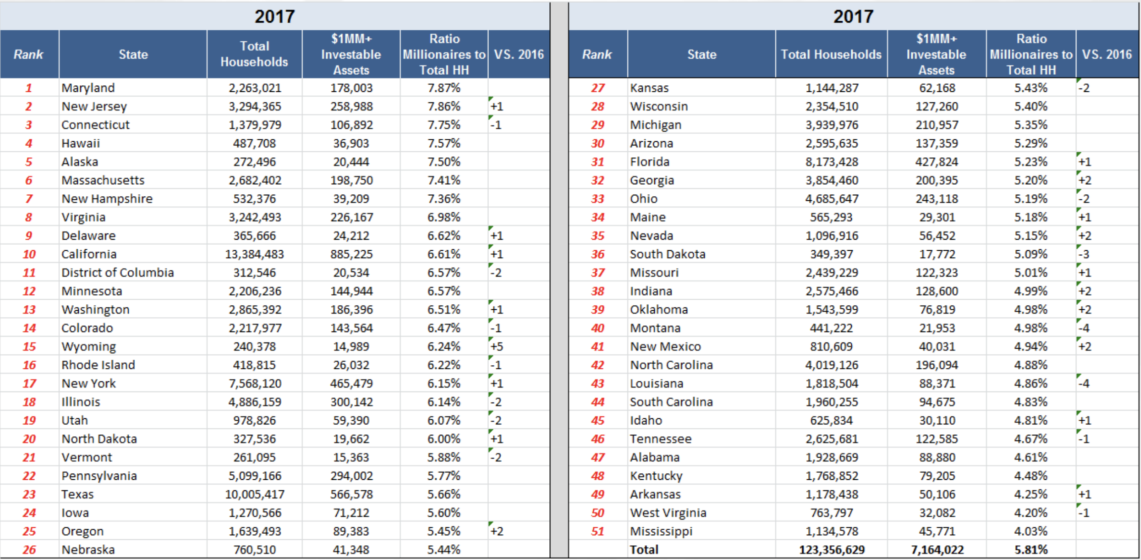 Maryland has the most millionaires per capita, while Mississippi has the fewest millionaires per capita. SEE STATE-BY-STATE BELOW
