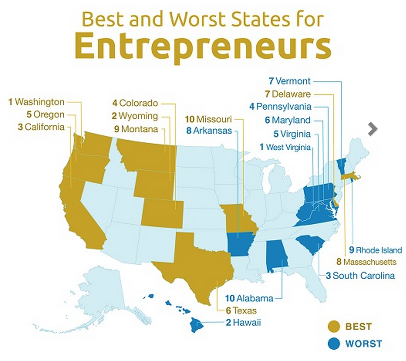 GOBankingRates conducted a study “to find out which U.S. states offer the best conditions for Americans wanting to start a business. The study found that while Washington, Wyoming and California are the best states for entrepreneurs, West Virginia, Hawaii and South Carolina are the least-friendly states for new business.”
