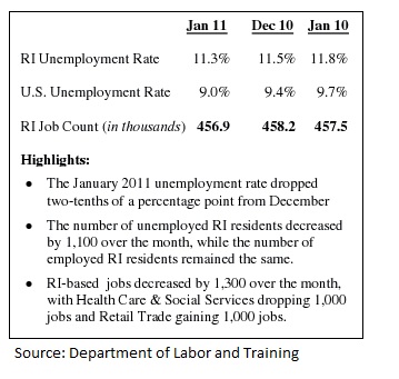 In Rhode Island, the number of unemployed residents decreased by 1,100 over December figures, falling to a total of 65,100 in January. Despite increasing employment, however, the state suffered a loss of 1,300 jobs over the past month.