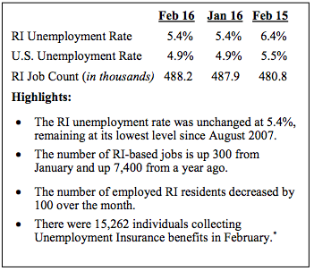 RI's February Unemployment Rate Remains at 5.4%, Same as January