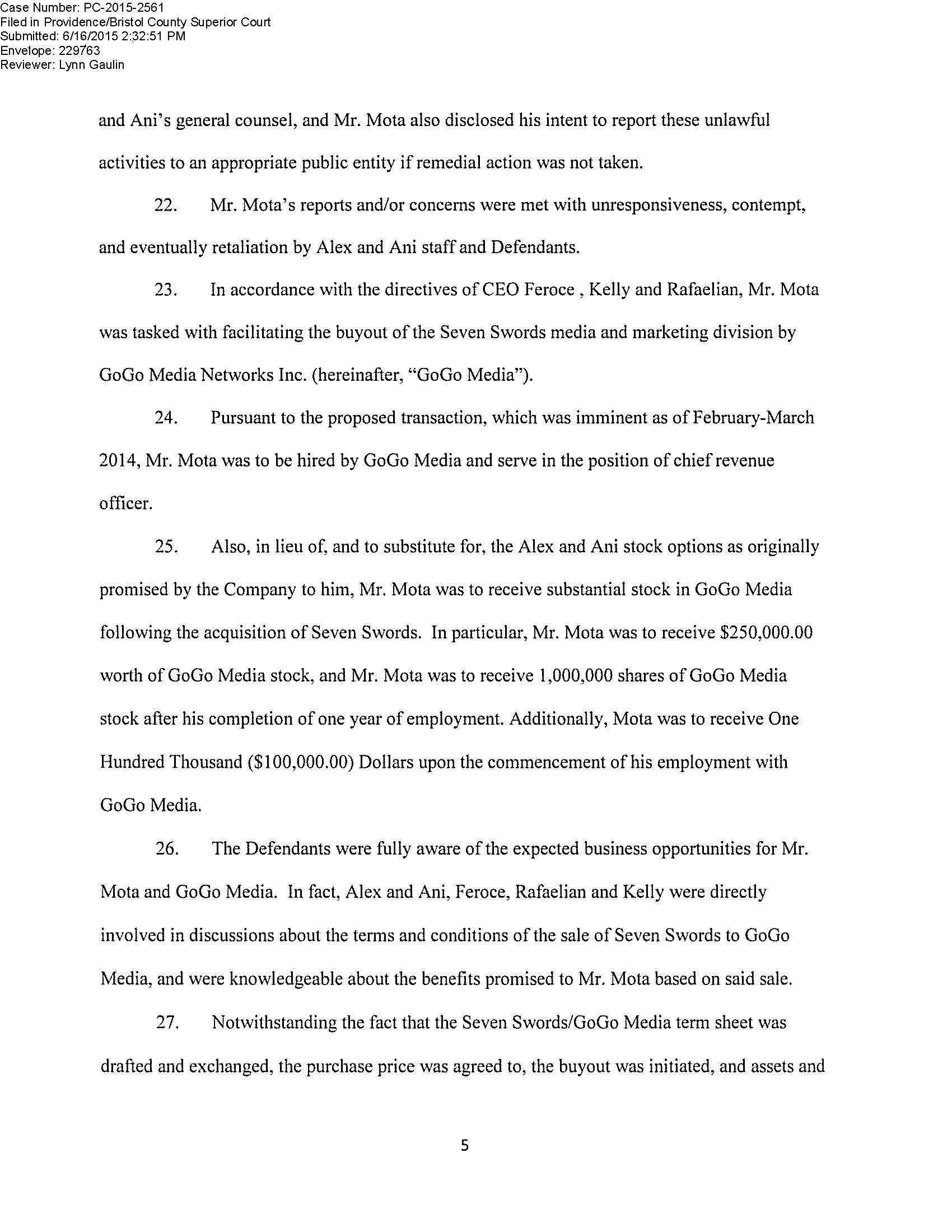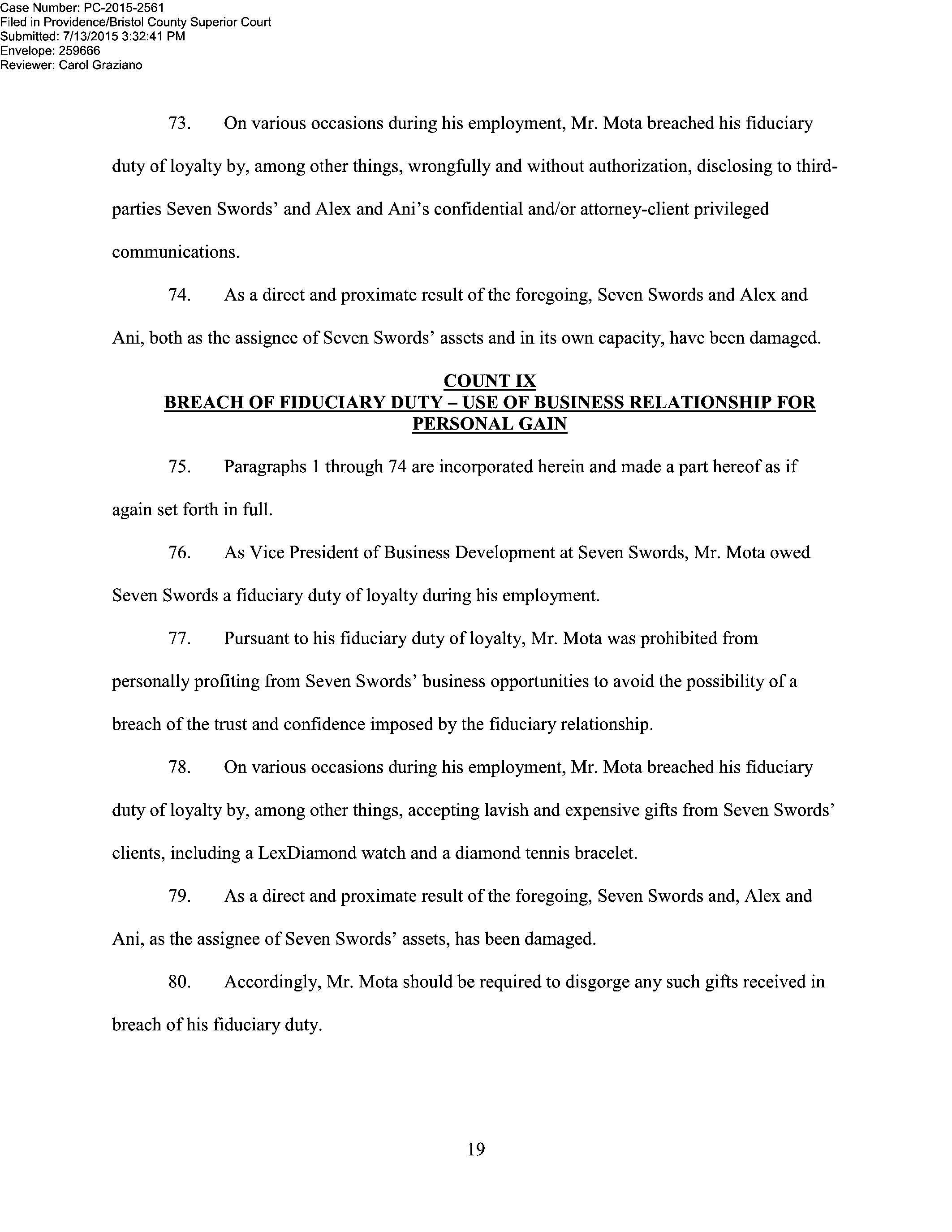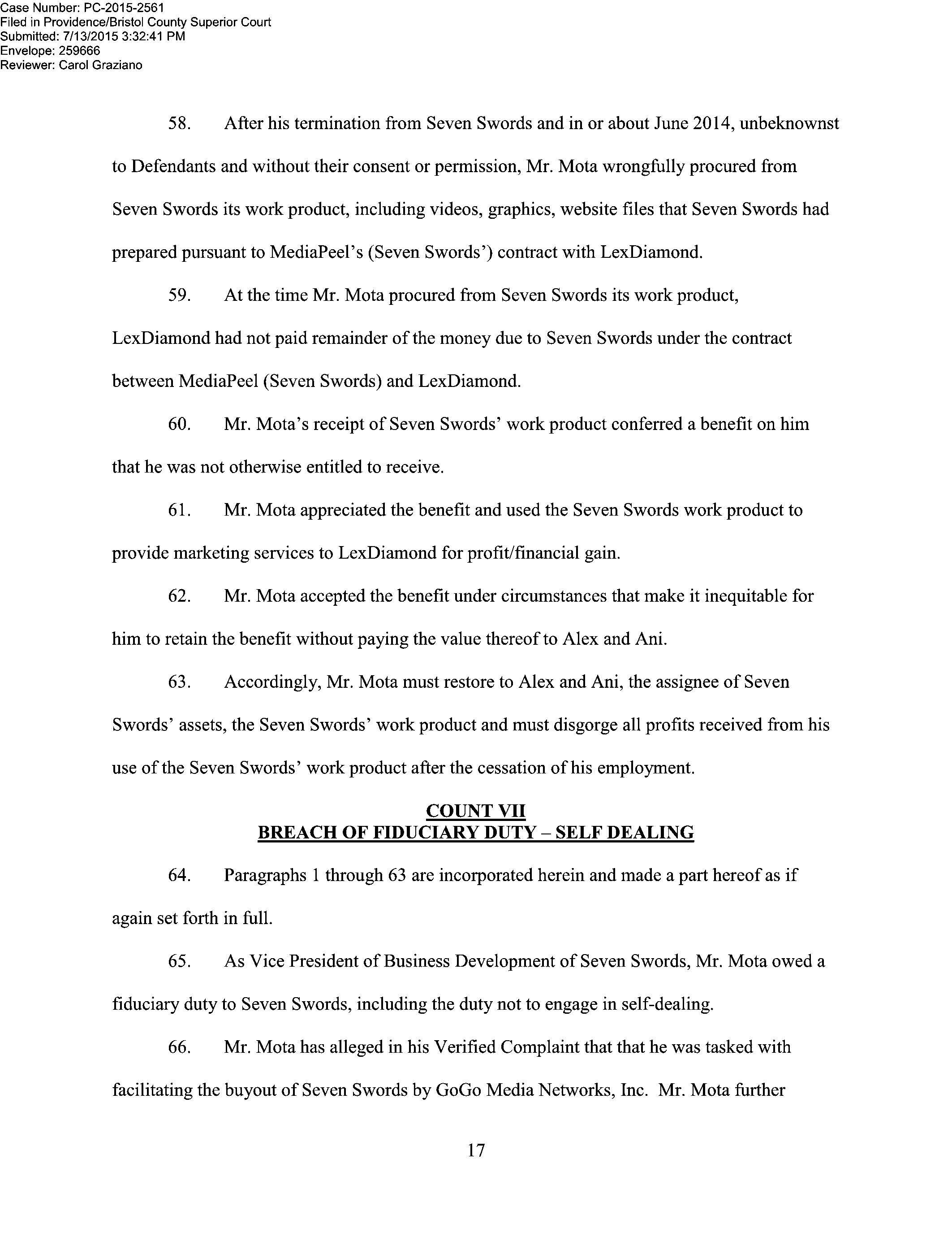 Defendants are without knowledge or information sufficient to form a belief as to the truth of Mr. Mota’s allegation, however, in the event Mr. Mota’s allegations are true, then he breached his fiduciary duty by self-dealing insofar as he stood on both sides of the transaction, expecting to derive a substantial personal financial benefit from it. At no time during his employment with Seven Swords did Mr. Mota disclose to any supervisor or the Seven Swords board that he was to receive a substantial financial benefit pursuant to the proposed transaction, including $100,000 upon the commencement of his employment with GoGo Media, substantial stock in GoGo Media within one year, and 1,000,000 shares of GoGo Media stock after the completion of one year of employment.