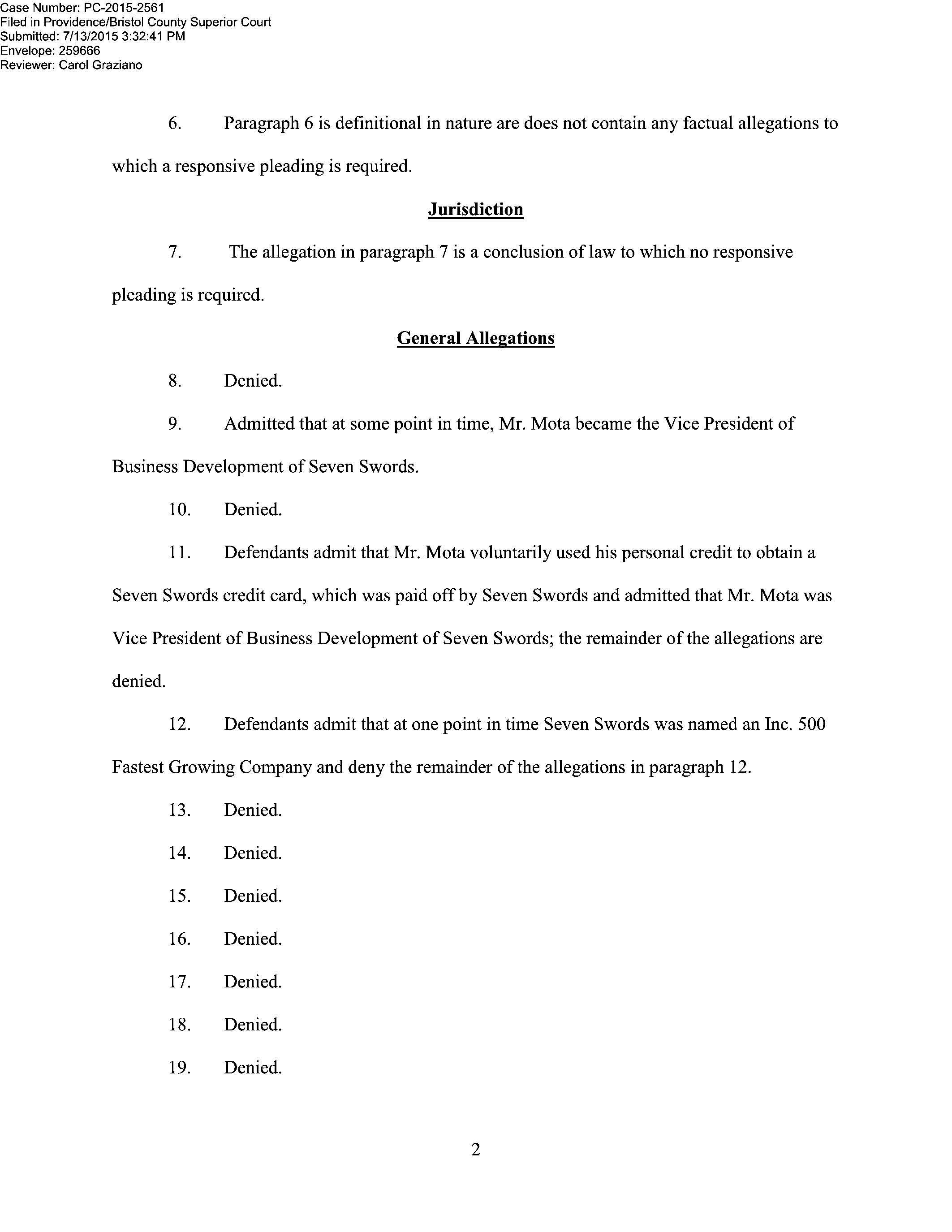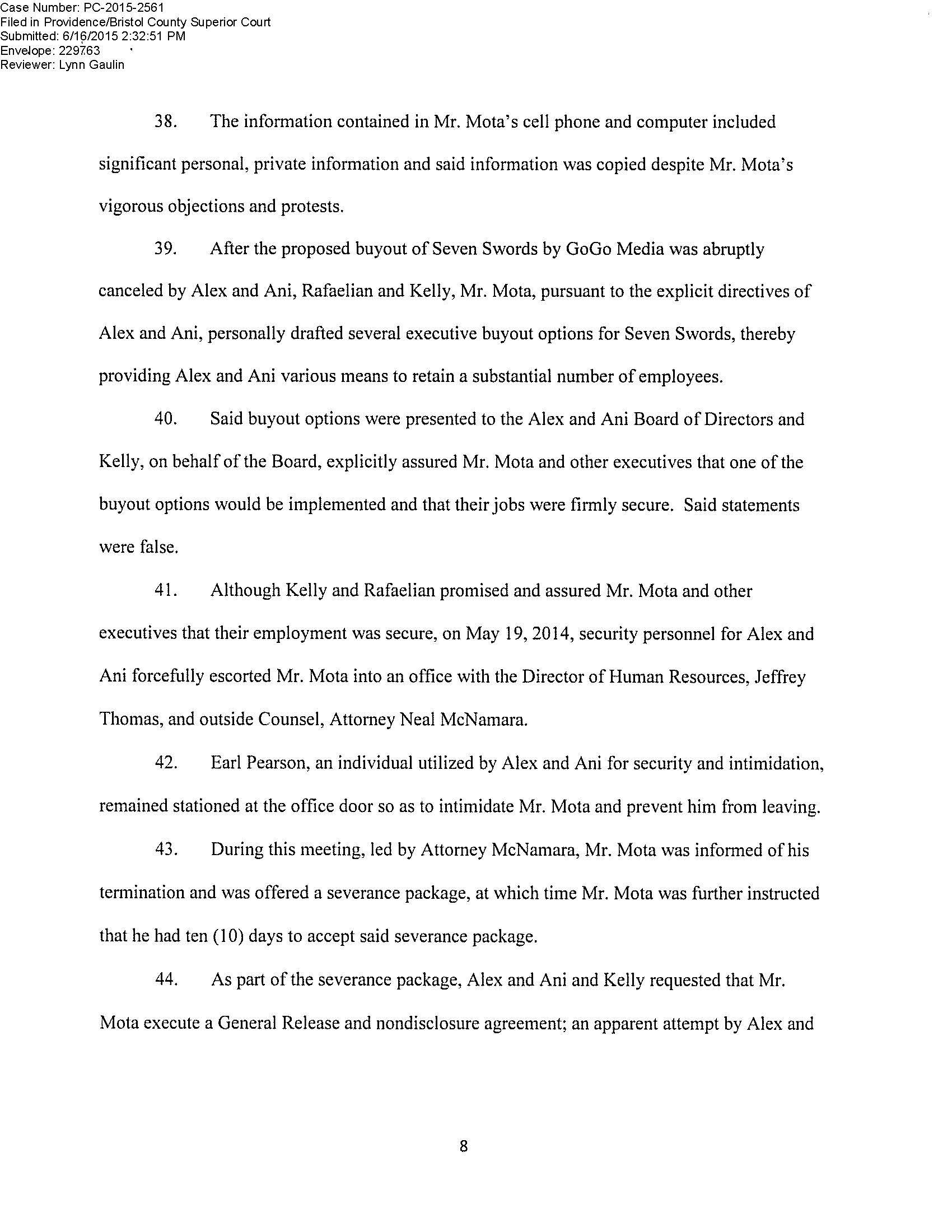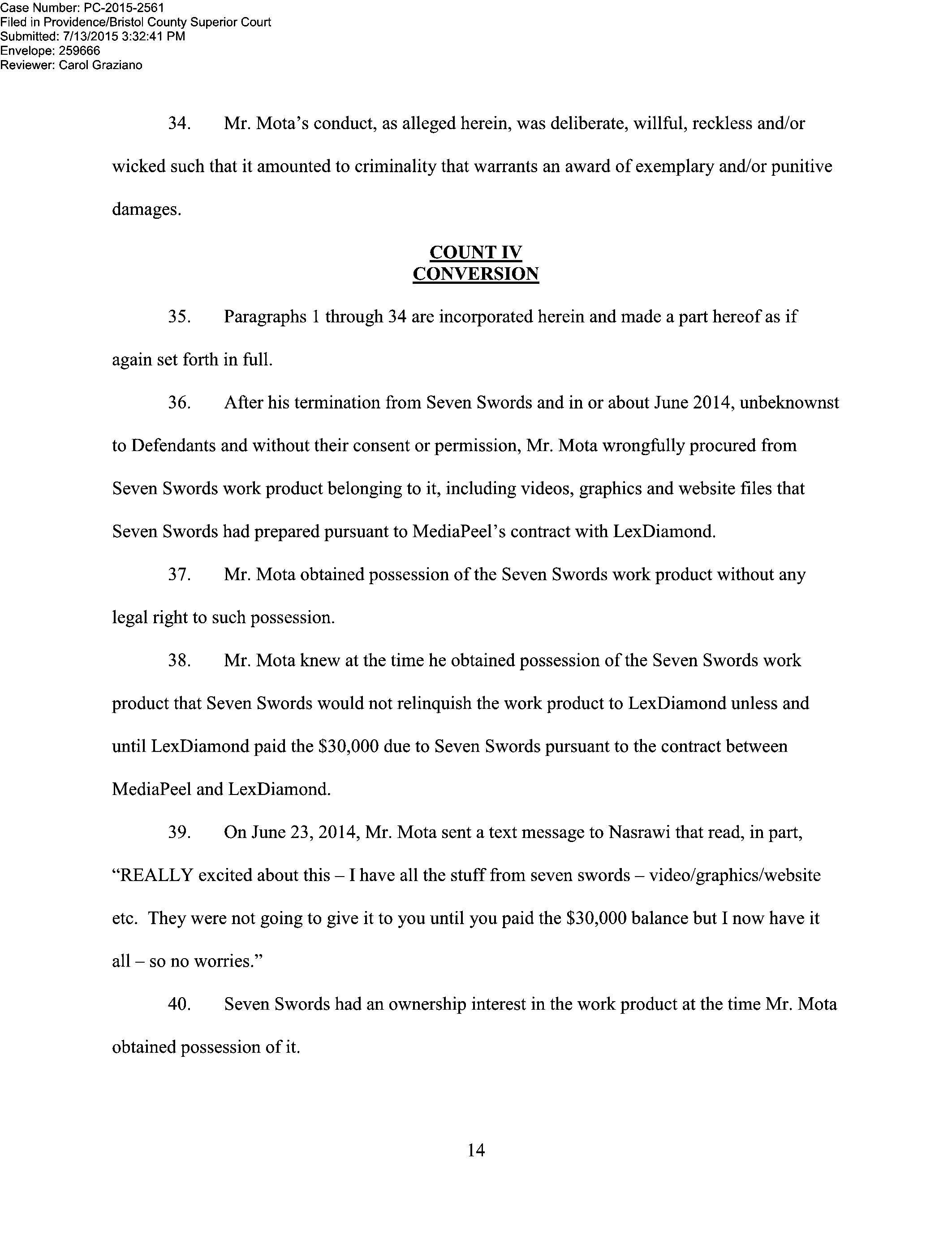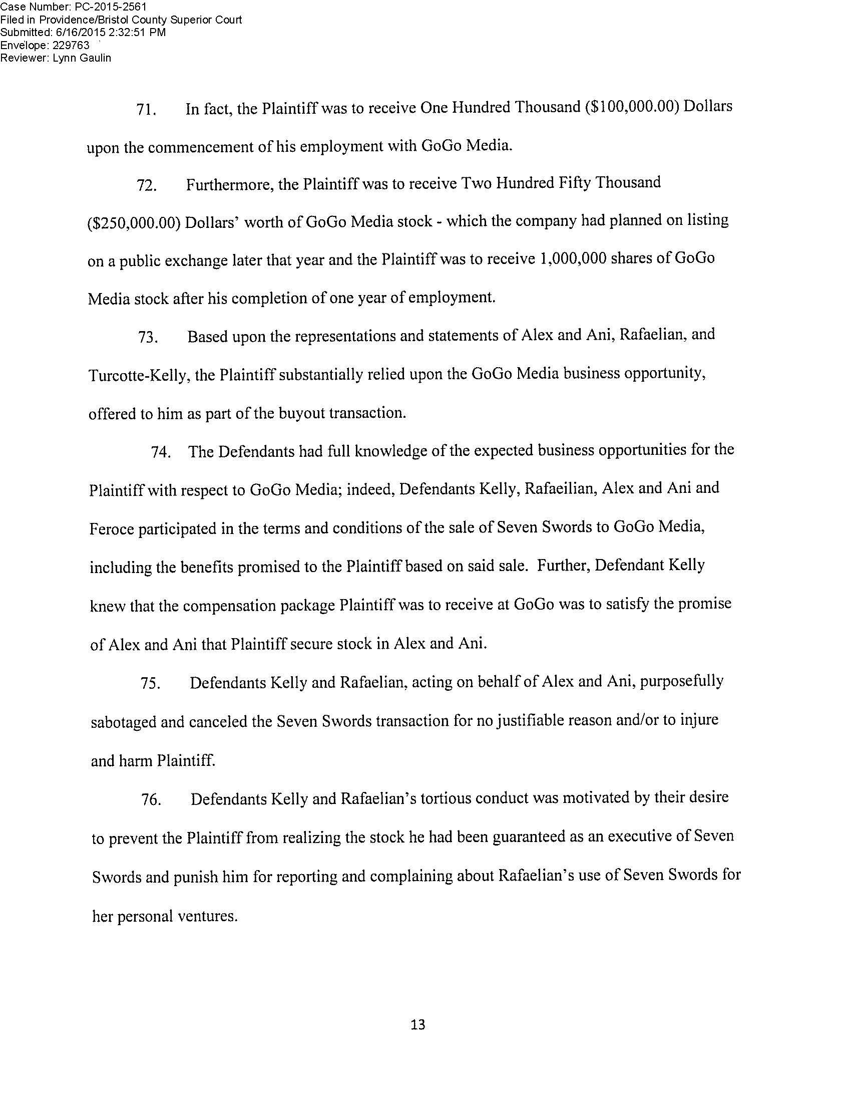 Defendants are without knowledge or information sufficient to form a belief as to the truth of Mr. Mota’s allegation, however, in the event Mr. Mota’s allegations are true, then he breached his fiduciary duty by self-dealing insofar as he stood on both sides of the transaction, expecting to derive a substantial personal financial benefit from it. At no time during his employment with Seven Swords did Mr. Mota disclose to any supervisor or the Seven Swords board that he was to receive a substantial financial benefit pursuant to the proposed transaction, including $100,000 upon the commencement of his employment with GoGo Media, substantial stock in GoGo Media within one year, and 1,000,000 shares of GoGo Media stock after the completion of one year of employment.