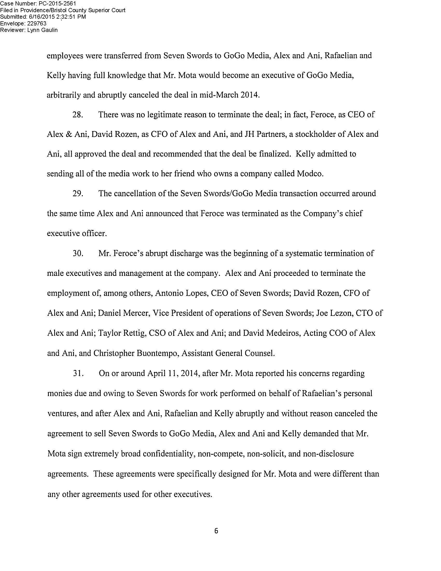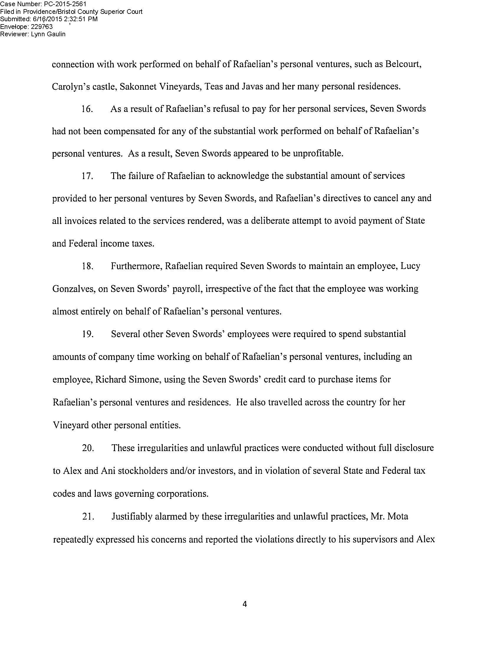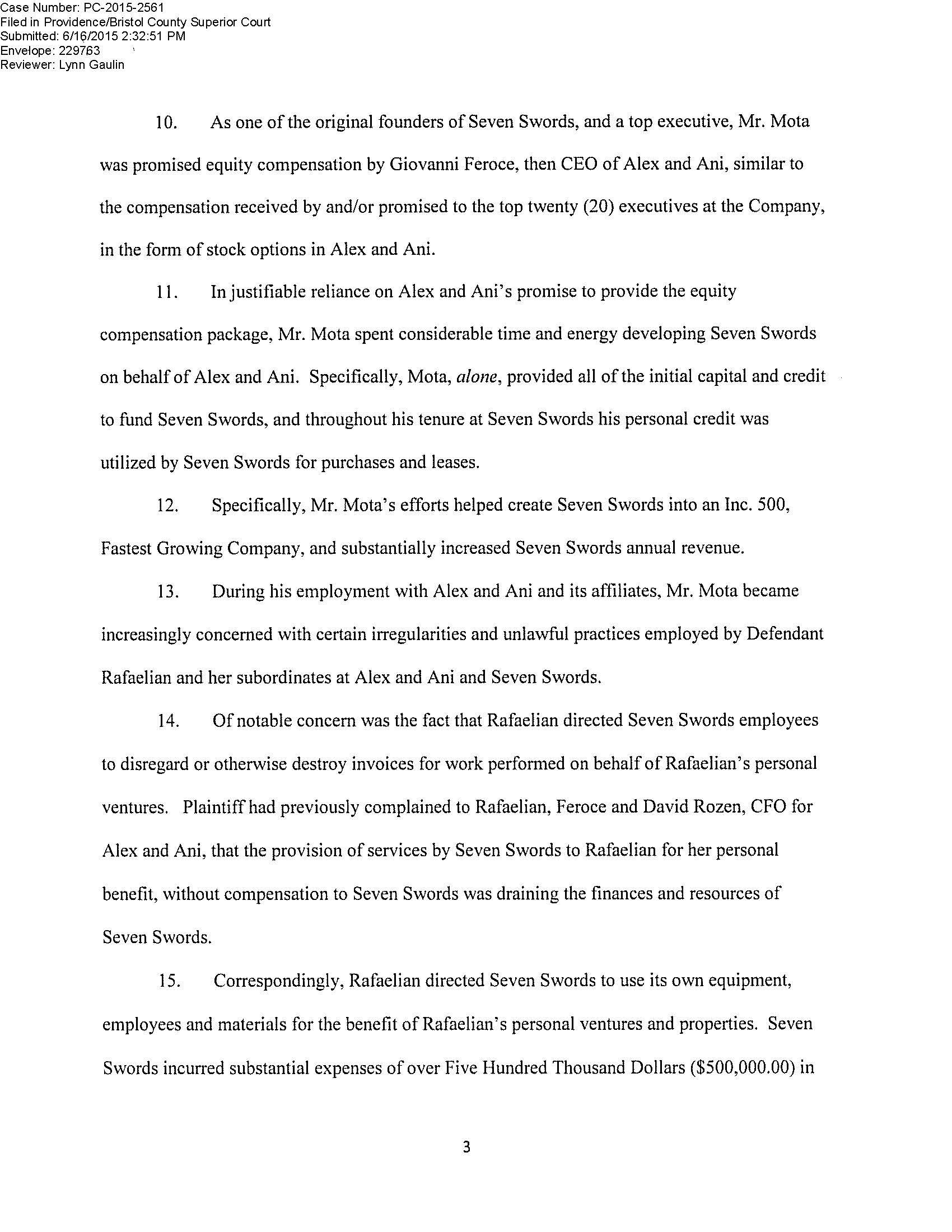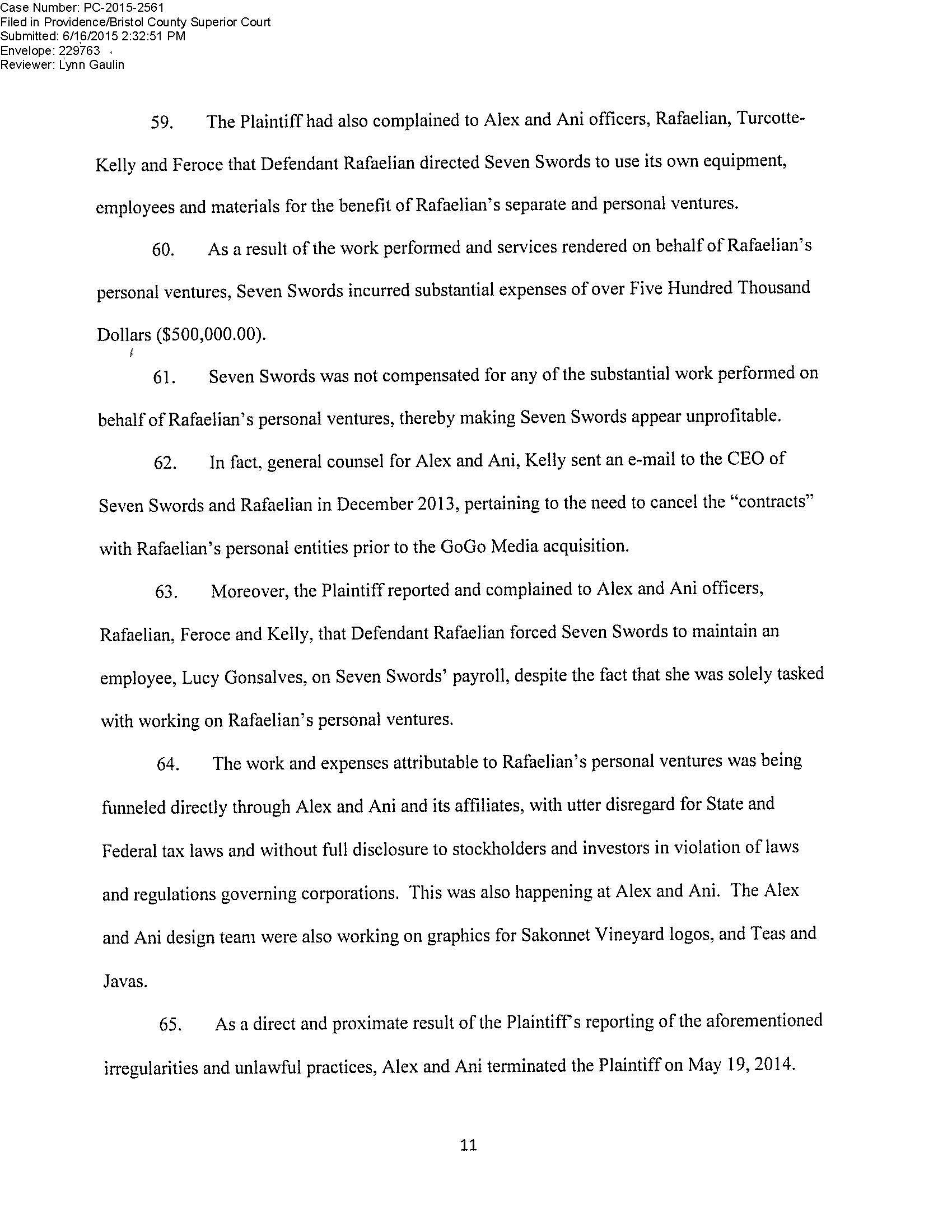 Of notable concern was the fact that Rafaelian directed Seven Swords employees to disregard or otherwise destroy invoices for work performed on behalf of Rafaelian’s personal ventures. Plaintiff had previously complained to Rafaelian, Feroce and David Rozen, CFO for Alex and Ani, that the provision of services by Seven Swords to Rafaelian for her personal benefit, without compensation to Seven Swords, was draining the finances and resources of Seven Swords.